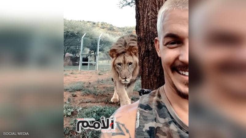 حيث لم ينقض الأسد على الرجل، بل داعبه قليلا، قبل أن يبتعد عن المكان.