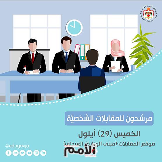 نشرت وزارة التربية أسماء مرشحين مدعوين للمقابلة الشخصية لوظيفة معلم ، وفقًا لأحقيتهم التنافسية بالتنسيق مع ديوان الخدمة المدنية الأردني.