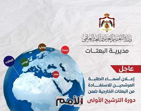 أعلنت مديرية البعثات في وزارة التعليم العالي والبحث العلمي اليوم الأحد الموافق 2 / 10 / 2022  أسماء الطلبة المرشحين للاستفادة من المنح الخارجية للعام الجامعي (2022 / 2023) ضمن دورة الترشيح الأولى، وذلك من خلال الموقع الإلكتروني لمديرية البعثات على الرابط التالي (www.dsamohe.gov.jo )  وكذلك من خلال إرسال رسائل نصية للطلبة المرشحين على أرقام الهواتف التي قاموا بتخزينها عند تقديم الطلبات.