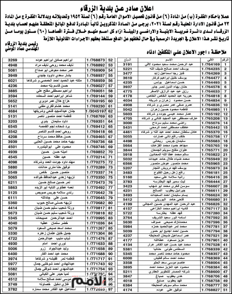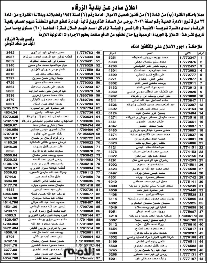 نشرت بلدية الزرقاء دفعة جديدة من اسماء الأشخاص المتخلفين عن دفع الضرائب المترتبة عليهم لصالح البلدية.