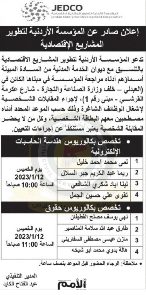 اعلان مقابلات شخصية صادر عن المؤسسة الاردنية لتطوير المشاريع الاقتصادية بتاريخ 12/1/2023