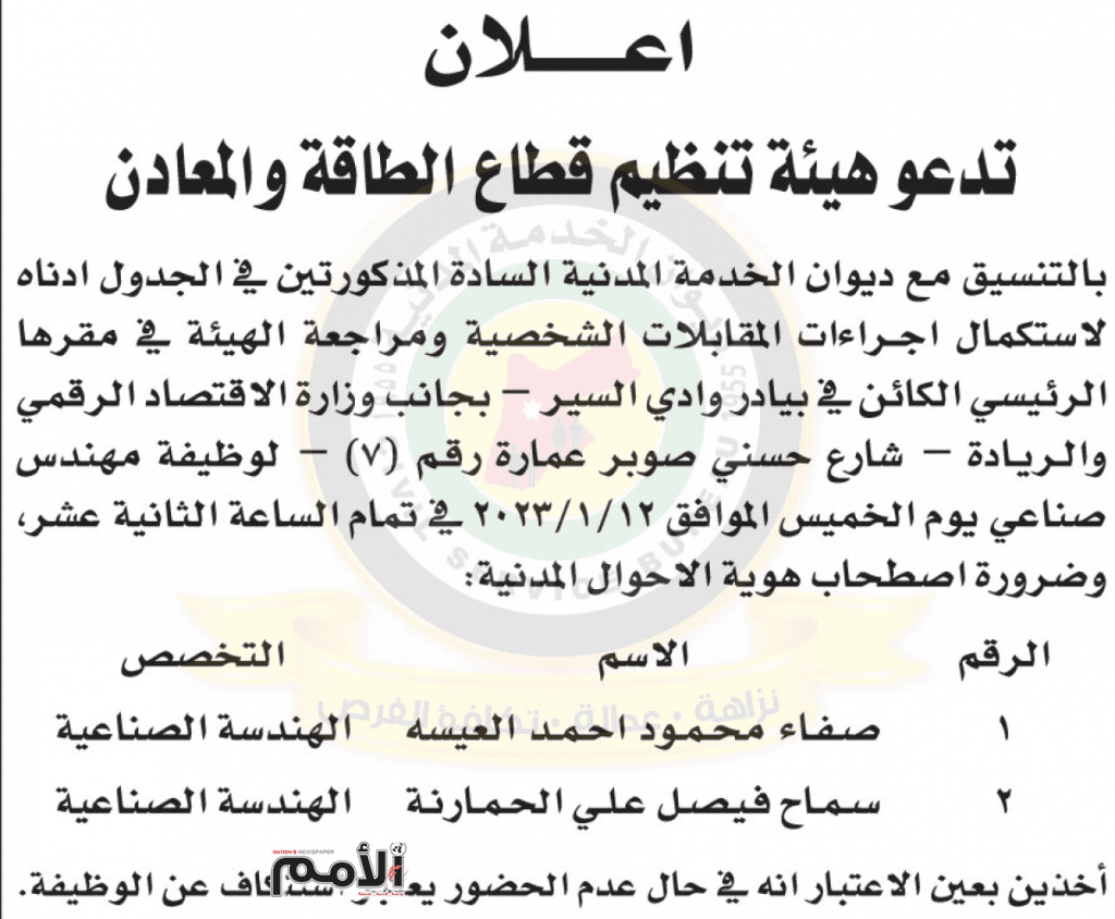 اعلان مقابلات شخصية صادر عن هيئة تنظيم قطاع الطاقة والمعادن بتاريخ 12/1/2023