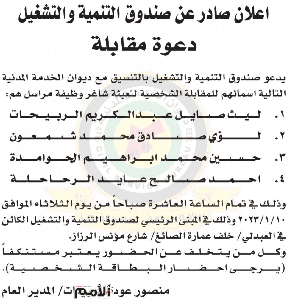 اعلان مقابلات شخصية صادر عن صندوق التنمية والتشغيل بتاريخ 10/1/2023