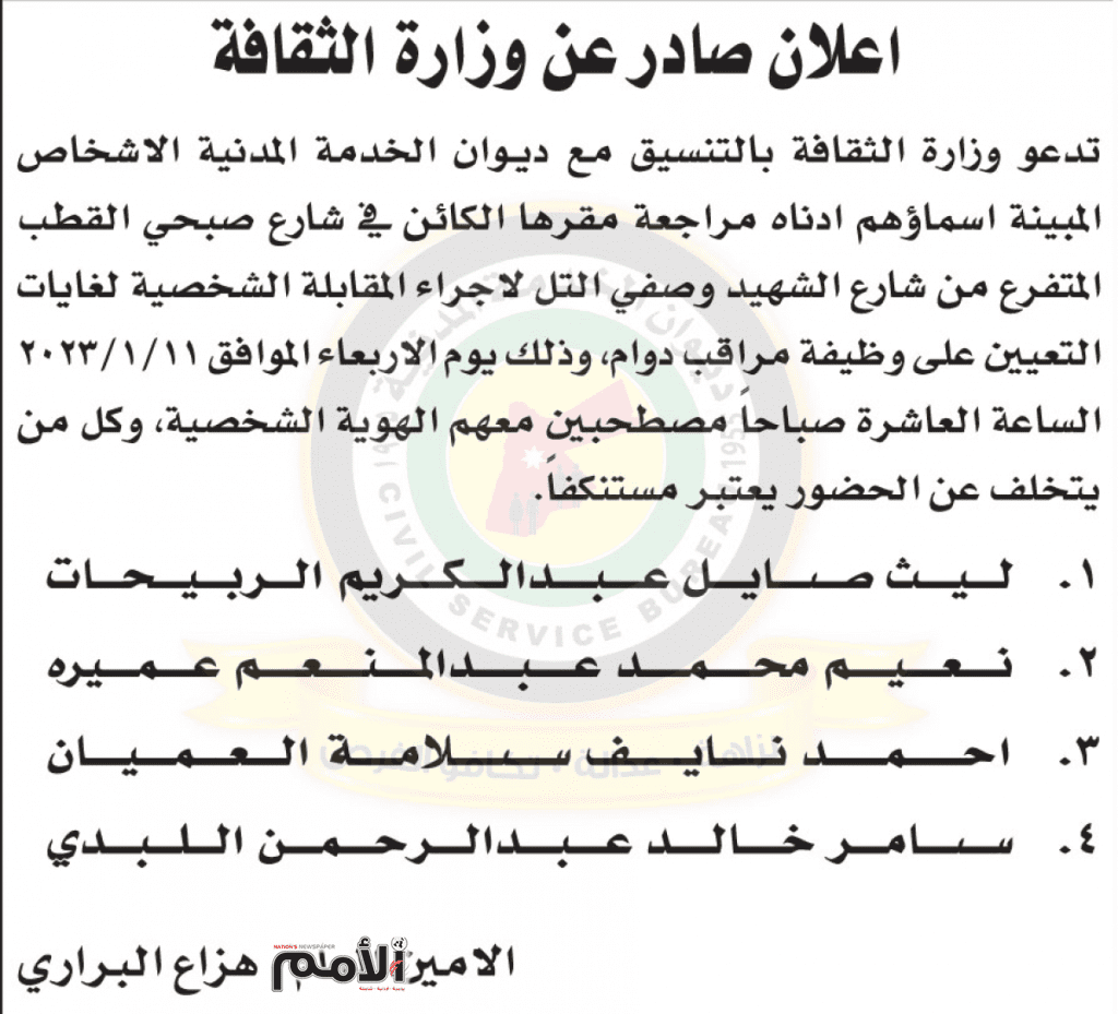اعلان مقابلات شخصية صادر عن وزارة الثقافة بتاريخ 11/1/2023