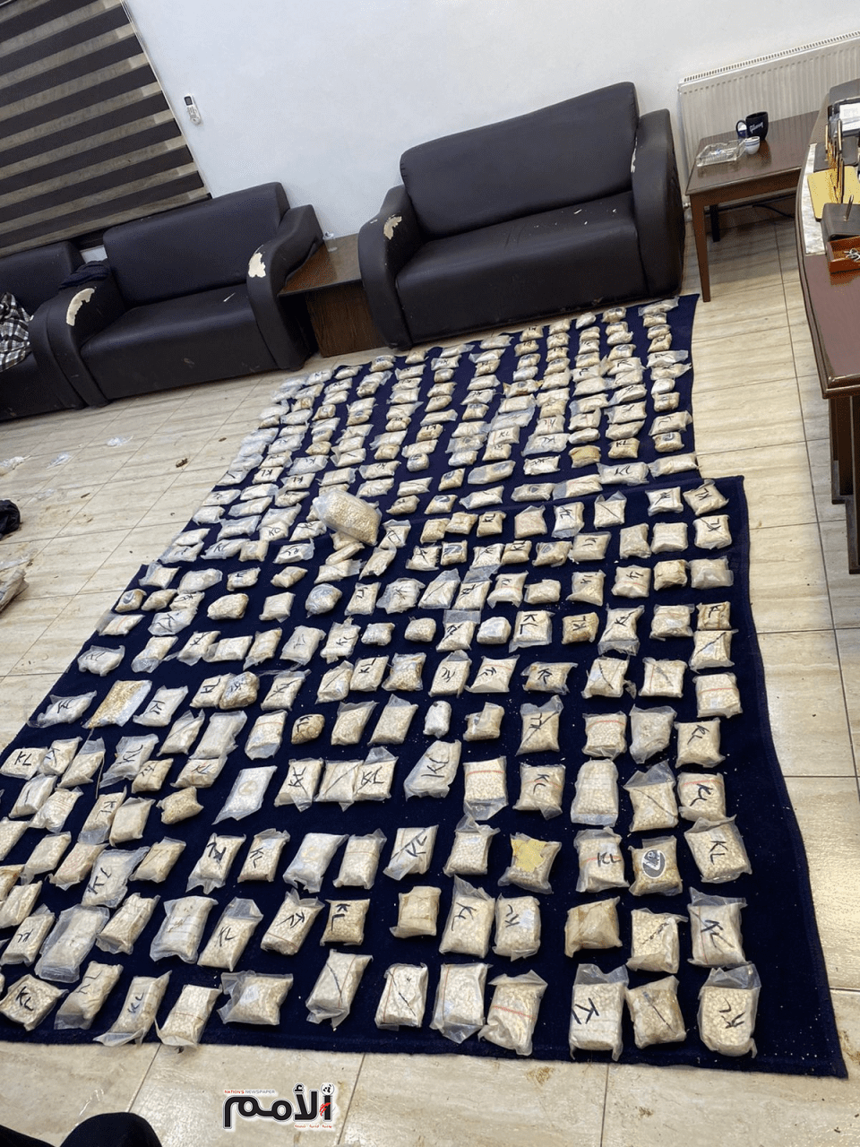 وفي سياق متّصل وفي احدى مناطق البادية الوسطى دوهم منزل احد تجار المخدرات وأُلقي القبض عليه وضبط داخل منزله بعد تفتيشه 35 كف حشيش و 6 آلاف حبة مخدرة .