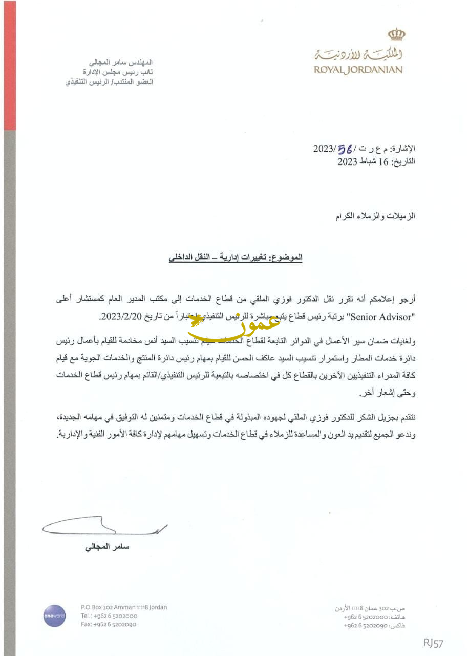 قرر نائب رئيس مجلس الإدارة / الرئيس التنفيذي للملكية الأردنية للطيران، المهندس سامر المجالي، نقل الدكتور فوزي الملقي من قطاع الخدمات إلى مكتب المدير العام كمستشار أعلى برتبة رئيس قطاع يتبع مباشرة للرئيس التنفيذي اعتبارا من تاريخ 20-2-2023.
