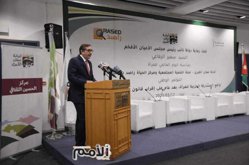 الامم – تحت رعاية نائب رئيس مجلس الأعيان سمير الرفاعي نفذ مركز الحياة – راصد بالتعاون مع أمانة عمان الكبرى – اللجنة المجتمعية مؤتمراً وطنياً بمناسبة يوم المرأة العالمي تحت عنوان “واقع المشاركة الحزبية للمرأة، بعد عام على إقرار قانون الأحزاب 2022 من قبل البرلمان الأردني”، وبحضور أمين عام وزارة الشؤون السياسية والبرلمانية الدكتور علي الخوالدة، وعدد من النخب السياسية والحزبية والنسائية والشبابية من مختلف القطاعات والمحافظات، ويأتي هذا المؤتمر انسجامًا مع رؤية الدولة الأردنية في التحديث الشامل، المتمثل في تحديث المنظومات السياسية والاقتصادية والإدارية، ومتوائمًا مع مخرجات اللجنة الملكية لتحديث المنظومة السياسية.