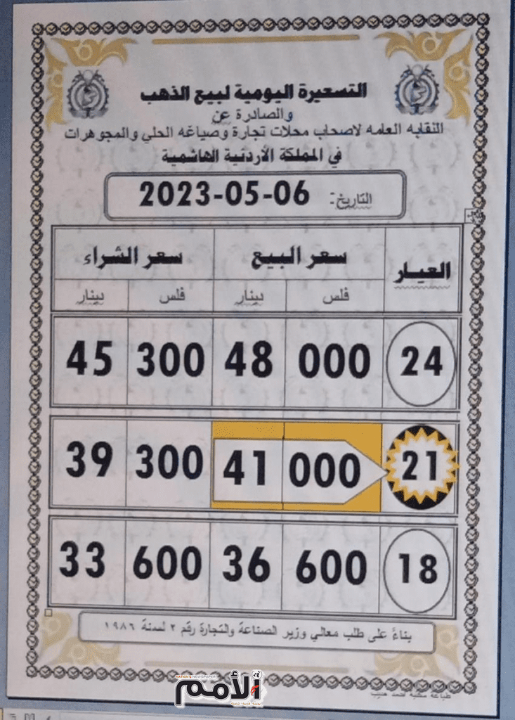 وبحسب التسعيرة اليومية، انخفض سعر شراء غرام الذهب عيار 21 الأكثر طلبا في السوق المحلية إلى 41 دينارا ، والبيع للصاغة إلى 39.30 دينارا.