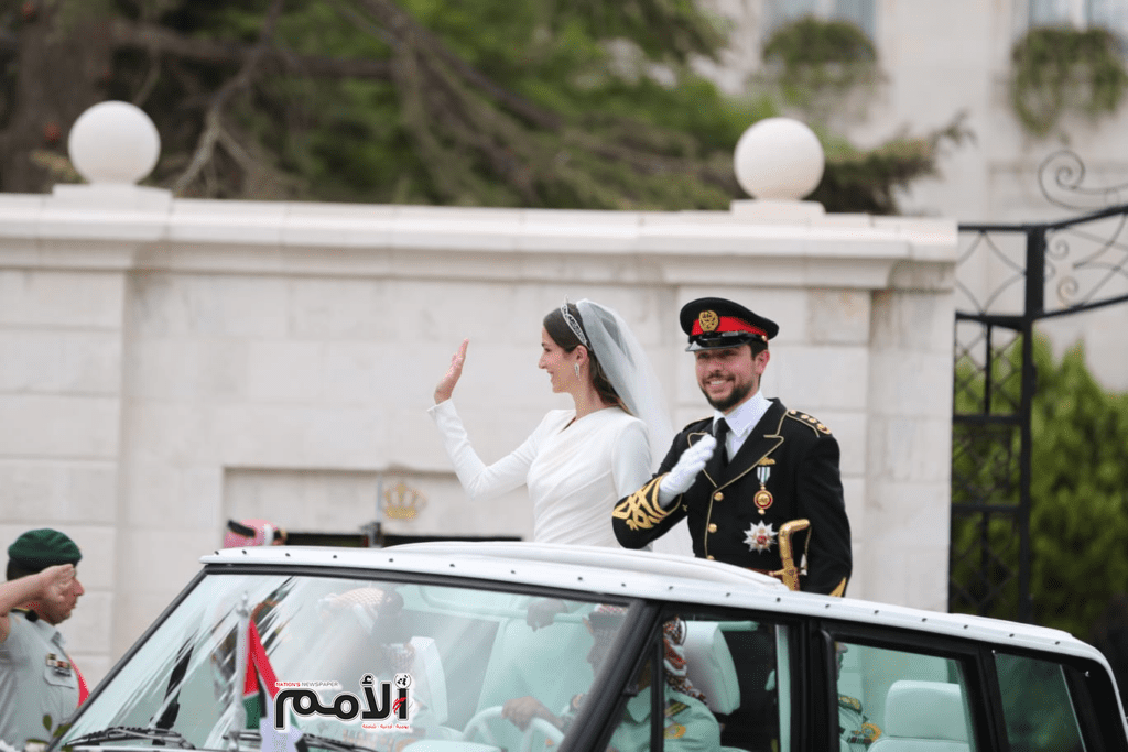 وصل سمو ولي العهد الأمير الحسين بن عبدالله الثاني، ترافقه عروسه سمو الاميرة رجوة الحسين إلى قصر الحسينية.