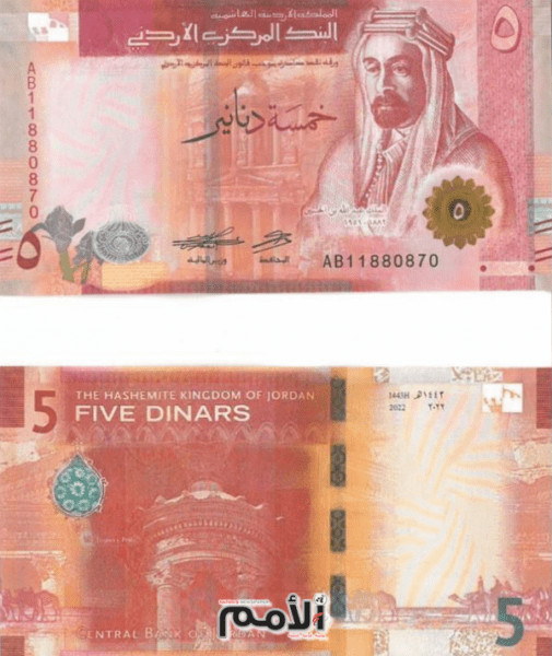 أعلن البنك المركزي الأردني عن بدء طرح فئة الخمسة دنانير/ الإصدار الخامس في التداول، والتي يزين وجهها صورة جلالة المغفور له الملك عبد الله الاول طيب الله ثراه، اعتباراً من اليوم الاربعاء الموافق 16 آب 2023 جنباً إلى جنب مع فئة الخمسة دنانير/ الإصدار الرابع.
