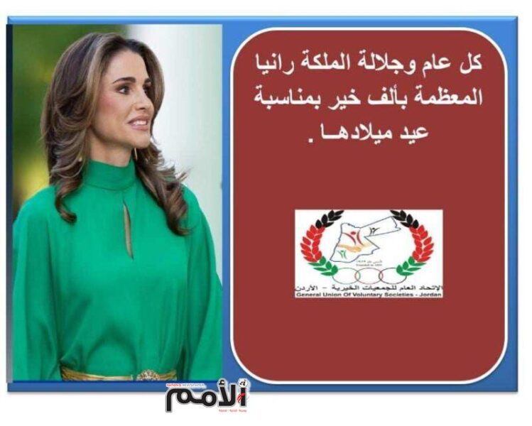 يسر الاتحاد العام للجمعيات الخيرية ممثلا برئيسه الدكتور عاطف عضيبات ونائب الرئيس عياش كريشان واعضاء الهيئة الاداريــة ومدير عام الاتحاد واليانصيب خليل القبيسي وكافة العاملين بالاتحاد وممثلي القطاع الخيري والتطوعـي ان يتقدموا بأسمـى آيات التهـاني والتبريكات إلى حضرة صاحبة الجلالة الملكة رانيا العبدالله المعظمة والعائلة الهاشمية بمناسبة عيد ميلاد جلالتها الميمون .