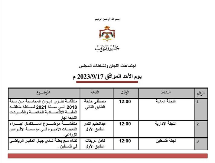 تجتمع لجان نيابية مختصة في مجلس النواب الأحد؛ لمناقشة قضايا عدة، أبرزها مناقشة اللجنة المالية النيابية الاستيضاحات والمخالفات المتعلقة بسلطة منطقة العقبة الاقتصادية الخاصة والشركات التابعة لها، وذلك في إطار مناقشة تقارير ديوان المحاسبة للأعوام: 2018 و2019 و2020 و2021.