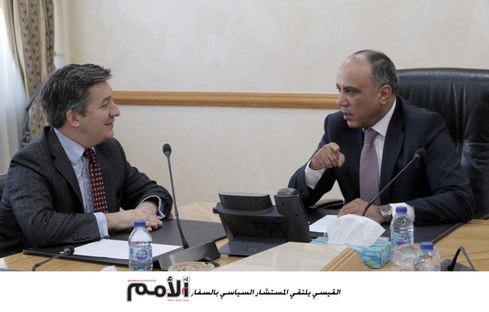 وعرض القيسي لمجمل القضايا التي اثرت على الواقع الاقتصادي وتداعيات الاوضاع في المنطقة وتأثيراتها خصوصا ملف اللاجئين السوريين، لافتا إلى انسجام الشعب الأردني بمؤسساته كافة مع توجيهات جلالة الملك عبدالله الثاني بهذا الشأن احتراما للقانون الدولي والقيم الإنسانية وحسن الجوار.