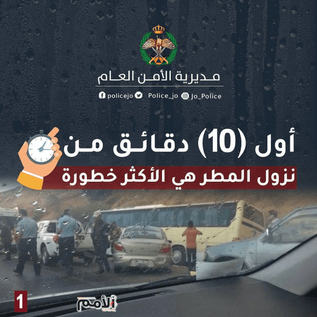 – حذرت مديرية الامن العام من الدقائق الـ 10 الأولى بعد نزول الامطار ، مشيرة الى انها الأكثر خطورة.