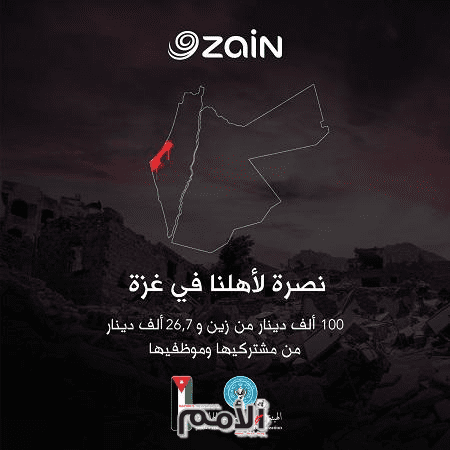 ضمن مبادراتها المستمرة تجاه الأهل في قطاع غزة منذ بدء العدوان الأخير، في إطار الهبّة الأردنية لنصرتهم في وجه الاحتلال واعتداءاته المستمرة والحصار المفروض عليهم منذ أسابيع؛ قدّمت شركة زين الأردن تبرّعاً نقدياً بقيمة 100 ألف دينار أردني، فيما قدم مشتركوها 9,024 دينار، بالإضافة إلى 17,700 دينار من موظفي الشركة، لإغاثة الأهل في قطاع غزة وإرسال المساعدات الإنسانية العاجلة وشراء الأدوية والمستلزمات الطبية للمستشفيات الفلسطينية والمواد الغذائية، بالتعاون مع الهيئة الخيرية الأردنية الهاشمية.