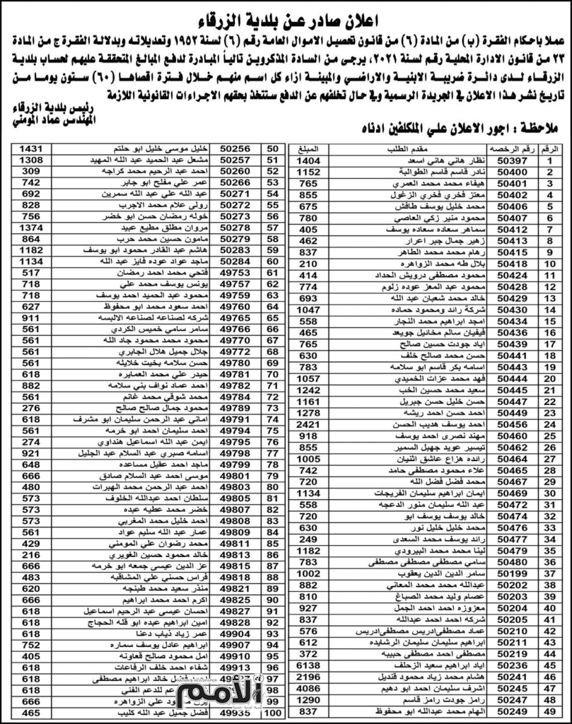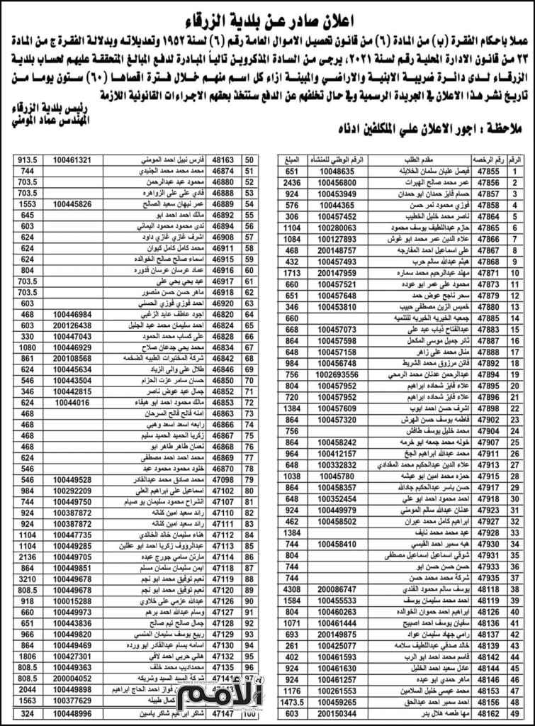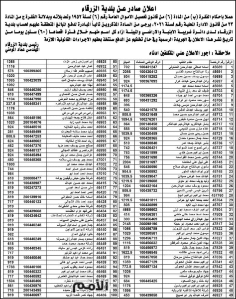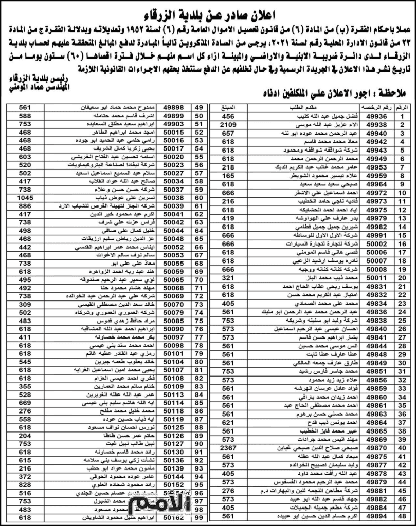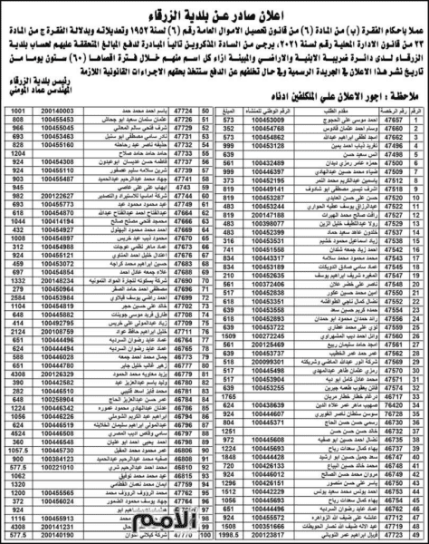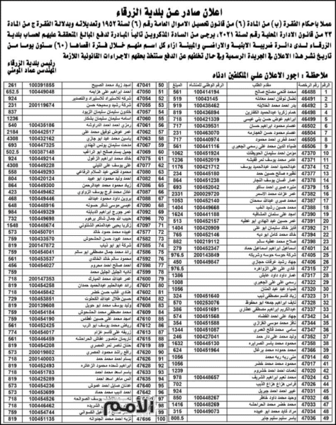 نشرت بلدية الزرقاء دفعة من اسماء الأشخاص المتخلفين عن دفع الضرائب المترتبة عليهم لصالح البلدية والبالغ عددهم (700) اسم .