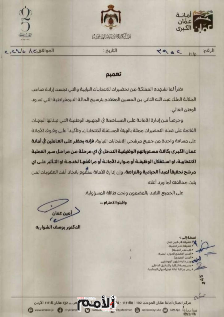 ووجه الشواربه تعميما حظر فيه التدخل في مراحل سير العملية الانتخابية حرصا من ادارة الامانة على المساهمة في الجهود الوطنية التي تبذلها الجهات القائمة التحضيرات للعملية الانتخابية ممثلة بالهيئة المستقلة للانتخابات.