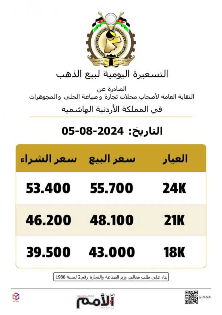 وانخفض سعر بيع غرام الذهب عيار 24 إلى 55.70 دينار، والشراء عند 53.40 دينار.