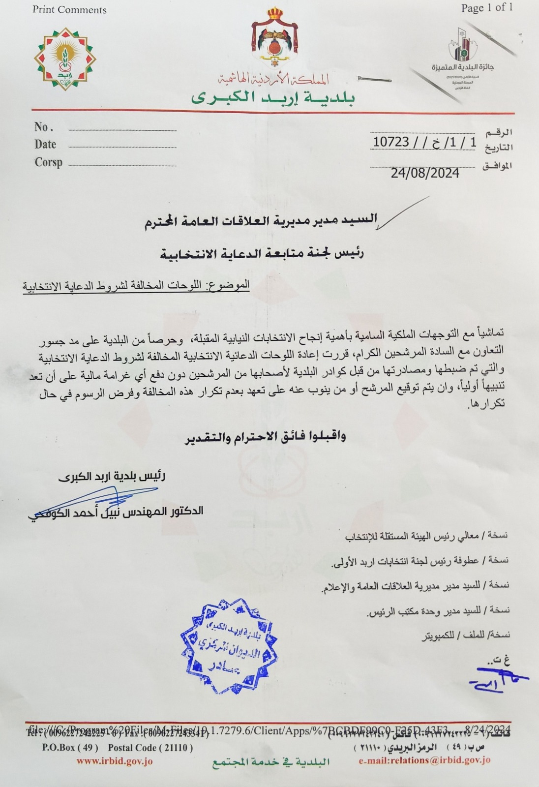 وأفاد الكتاب المرسل من رئيس البلدية إلى مدير مديرية العلاقات العامة ورئيس لجنة متابعة الدعاية الانتخابية، انه وتماشيا مع التوجيهات الملكية السامية بأهمية انجاح الانتخابات النيابية المقبلة، وحرصا على مد جسور التعاون مع المرشحين، فقد اتخذت البلدية القرار المذكور اعلاه، مع التأكيد على ان يقوم المرشح أو من ينوب عنه على التعهد بعدم تكرار هذه المخالفة وفرض الرسوم في حال تكرارها.
