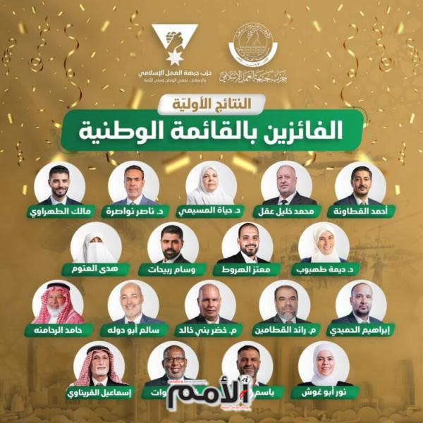 أعلن حزب جبهة العمل الإسلامي فوز قائمته المرشحة للانتخابات النيابية 2024 في الدائرة العامة بـ 18 مقعدا وفق النتائج الأولية وبعد فرز 99% من الأصوات، وحصولها على 462 ألف صوت.