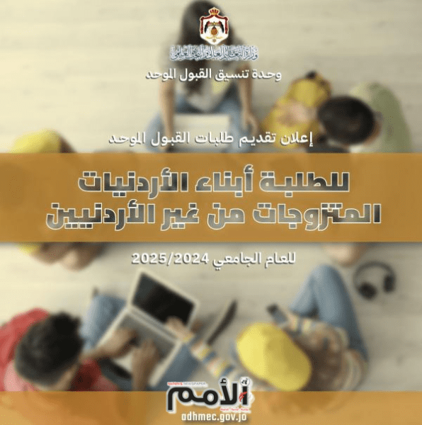 • يتم قبول الطلبة أبناء الأردنيات حسب الحدود الدنيا لمعدلات القبول التنافسية للطلبة الأردنيين الحاصلين على شهادة الدراسة الثانوية العامة الأردنية في العام الحالي (2024-2025)، والتي تم إعلانها على موقع وحدة تنسيق القبول الموحد.