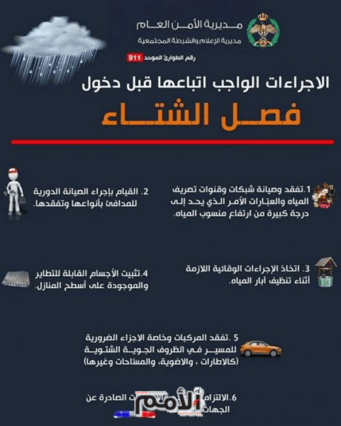 أفادت مديرية الأمن العام أنه ومع دخول فصل الخريف تزداد نسب سقوط الأمطار والتقلبات الجوية، وفي هذه الأثناء يتعامل البعض مع التغيرات الجوية دون استعداد، أو أنه يُفاجأ بأمر من المفترض أن يكون متوقعاً.