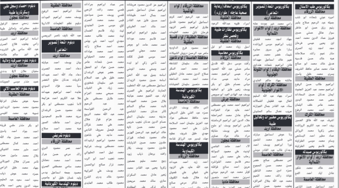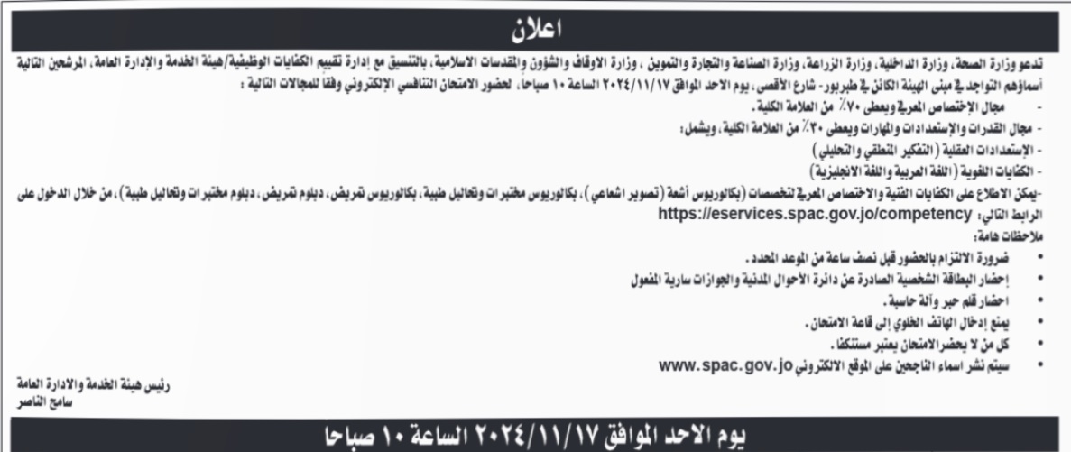 دعت وزارات ومؤسسات حكومية وبلديات ،الأحد، بالتنسيق مع بالتنسيق مع ادارة تقييم الكفايات الوظيفية/ هيئة الخدمة والادارة العامة المرشحين التالية اسماؤهم التواجد في مبنى الهيئة الكائن في طبربور، وذلك لحضور الامتحان التنافسي والكفايات الوظيفية.