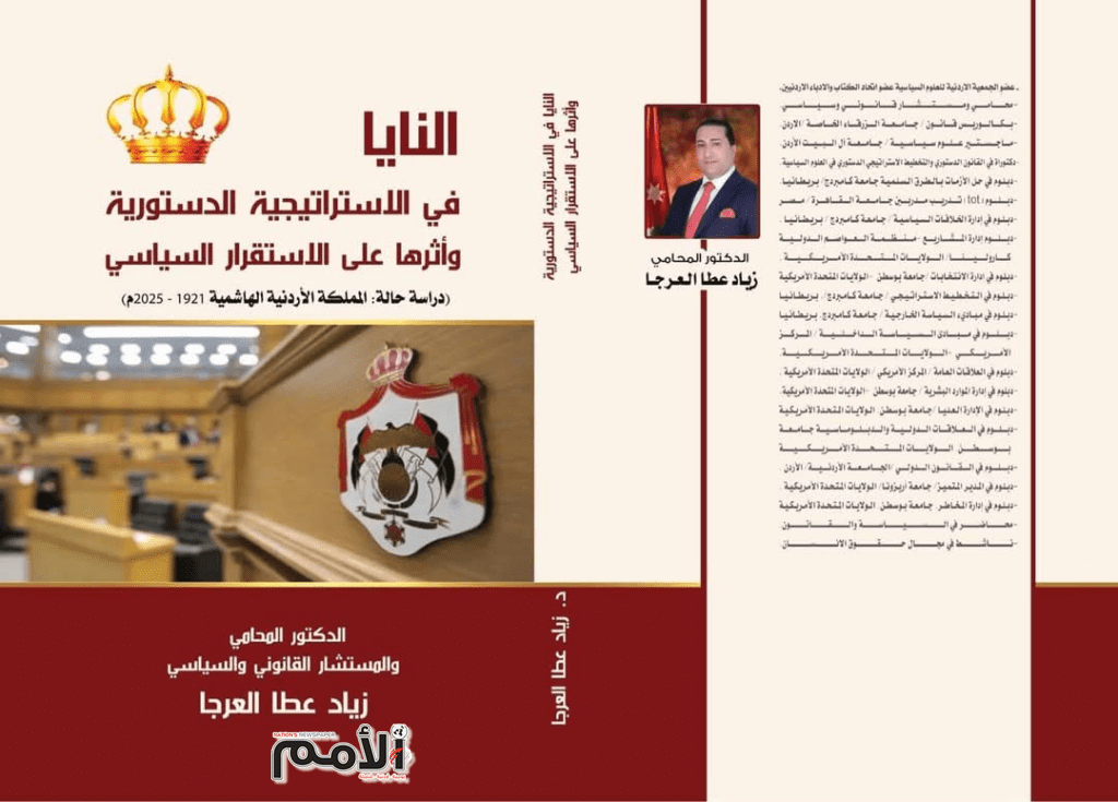 صدر حديثا الكتاب الخامس للدكتور زياد عطا العرجا، بعنوان ” النايا في الاستراتيجية الدستورية وأثرها على الاستقرار السياسي”، واشتمل على دراسة حالة ( المملكة الأردنية الهاشمية 1921 – 2025 ).