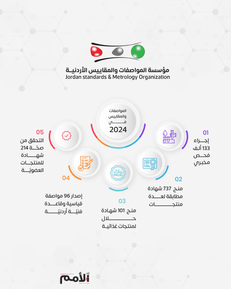 وبينت الزهير، أن المؤسسة أيضاً تمنح علامة الجودة الأردنيّة التي تشير إلى أن المنتج يمتاز بجودة عالية ويلبّي اشتراطات أعلى من متطلّبات المواصفة القياسيّة الخاصّة به، مما يمنحه أفضليّة وتنافسيّة اعلى في الأسواق، مشيرةً إلى أن المؤسسة منحت علامة الجودة الأردنية لـ 141 منتجاً لـ 56 منشأة خلال العام المنصرم.