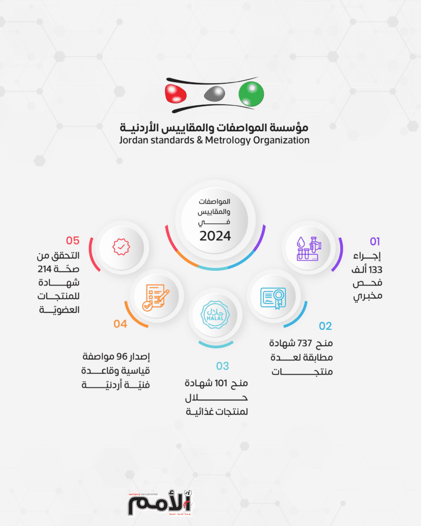 وأكدت الزّهير إلى أنّ المؤسسة تحرص عند إعداد المواصفات القياسية والقواعد الفنية على مواكبة التطوّرات العلمية المتسارعة وتلبية متطلبات القطاعين الصناعي والتجاري وبما يضمن جودة وسلامة المنتجات، وقد أصدرت المؤسسة 96 مواصفة قياسية وقاعدة فنيّة أردنيّة في القطاع الكيماويّ وقطاع الصّناعات الهندسيّة و قطاع المنتجات الغذائيّة، مؤكدة على حرص المؤسسة على دعم الصناعات عالية القيمة التي تعدّ واحدة من أبرز محرّكات النّموّ لتنفيذ رؤية التّحديث الاقتصاديّ.