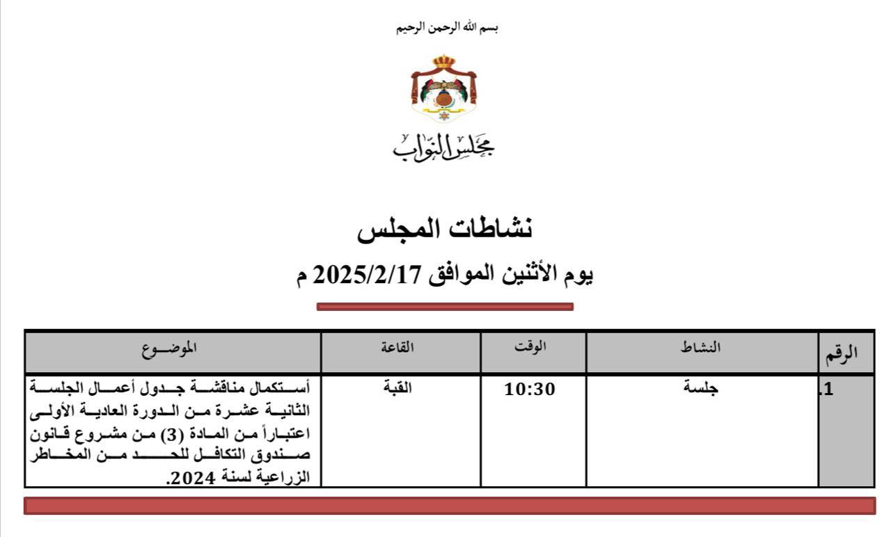 – يعقد مجلس النواب جلسة تشريعية ،الاثنين، لمناقشة عدة قوانين مدرجة على جدول الأعمال.ويستكمل النواب مناقشة جدول أعمال الجلسة الثانية عشرة من الدورة العادية الأولى والمتضمن مشروع قانون صندوق التكافل للحد من المخاطر الزراعية لسنة 2024 اعتبارا من المادة (3)، وقرار اللجنة القانونية رقم (2) تاريخ 27/1/2025 والمتضمن مشروع قانون معدل لقانون الإقامة وشؤون الاجانب لسنة 2024، وقــرار اللجنة الإدارية رقم (3) تاريخ 28/1/2025 والمتضمن مشروع قانون معدل لقانون إعادة هيكلة مؤسسات ودوائر حكومية لسنة 2025.
