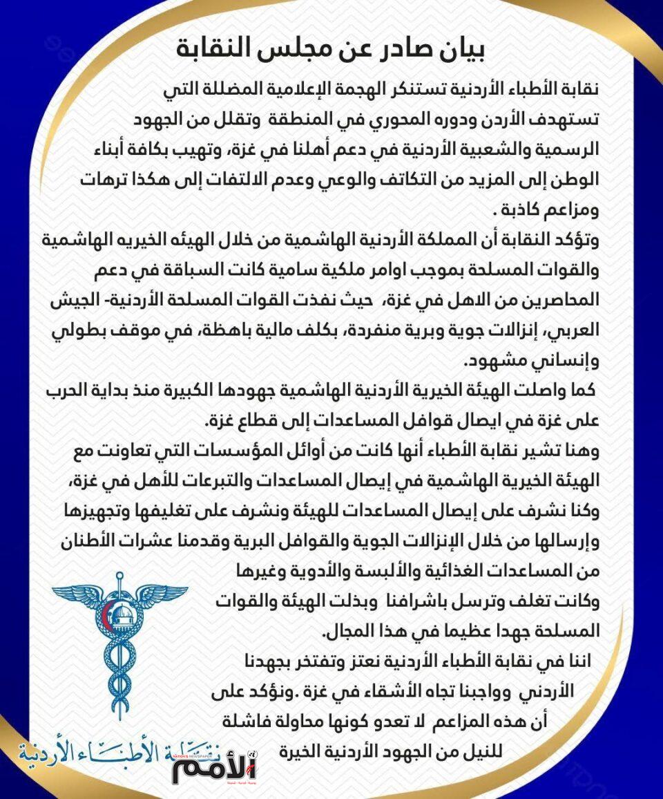 اننا في نقابة الأطباء الأردنية نعتز وتفتخر بجهدنا الأردني وواجبنا تجاه الأشقاء في غزة .ونؤكد على أن هذه المزاعم لا تعدو كونها محاولة فاشلة للنيل من الجهود الأردنية الخيرة