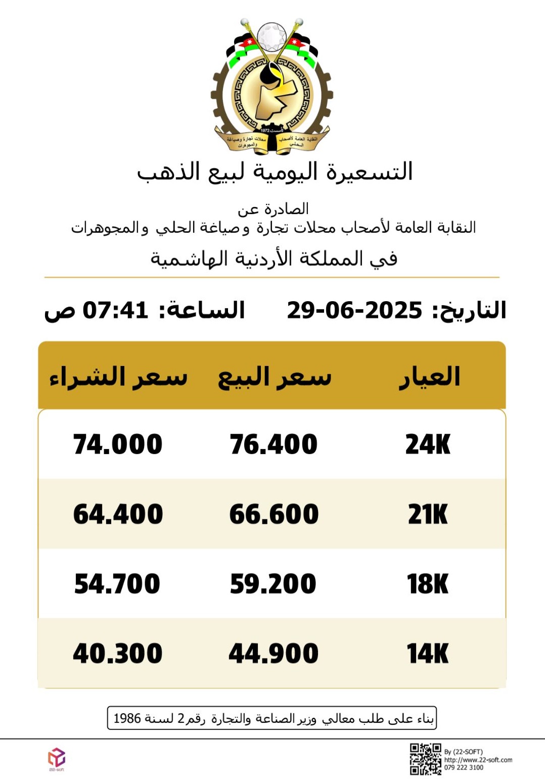 أسعار الذهب في الاسواق المحلية الأحد شارك – استقرت أسعار الذهب في السوق المحلي اليوم الأحد، وفقا للتسعيرة اليومية الصادرة عن النقابة العامة لاصحاب محلات تجارة وصياغة الحلي والمجوهرات.وبلغ سعر بيع غرام الذهب من عيار 21، الأكثر طلبًا بين المواطنين، 66.60 دينارًا في محلات الصاغة، فيما بلغ سعر الشراء 64.40 دينارًا.أما أسعار شراء غرام الذهب لعيارات 24 و18 و14 في محلات الصاغة، فقد بلغت 76.40 دينارًا، و59.20 دينارًا، و44.90 دينارًا على التوالي. Share and Enjoy !Shares