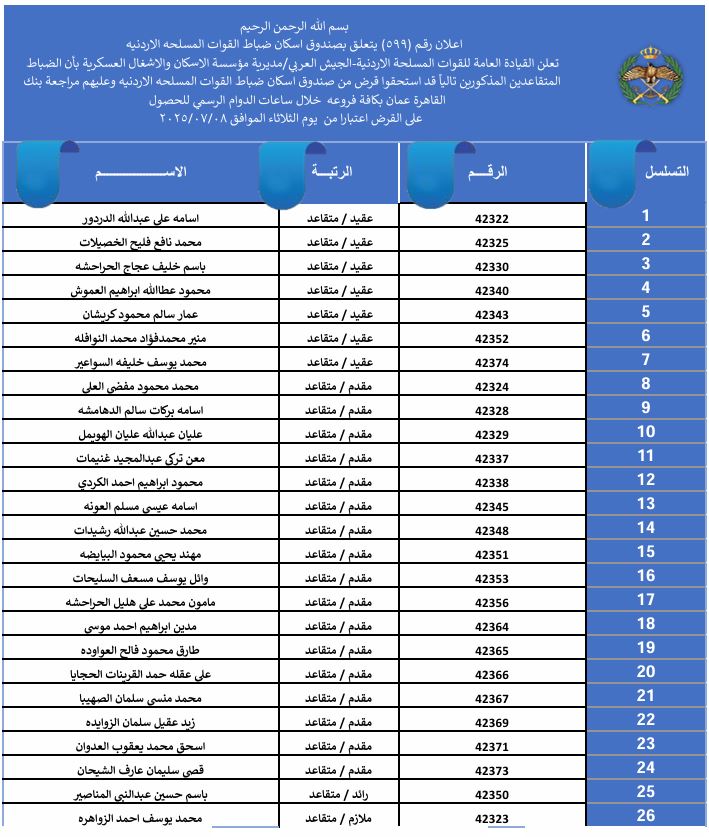 ودعت الضباط وضباط الصف والأفراد المستحقين لقرض الإسكان العسكري (الخاص بالأفراد) والضباط المستفيدين من صندوق إسكان الضباط مراجعة بنك القاهرة عمان بكافة فروعه خلال ساعات الدوام الرسمي اعتباراً من يوم الثلاثاء الموافق 8/07/2025 للحصول على القرض.