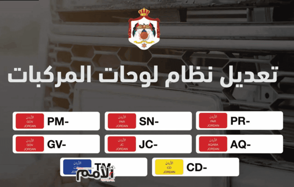 وبموجب التَّعديل، ستحمل لوحات المركبات الحكومية والإدخال المؤقت والدبلوماسية حروفاً واضحة تدل على الجهة التي تتبع لها المركبة وعلى النحو الآتي: رئيس الوزراء والوزراء الرمز PM، مجلس الأعيان SN، ومجلس النواب PR، والمجلس القضائي JC، والجهات الحكومية GV، وسلطة منطقة العقبة الاقتصادية AQ، والهيئات الدبلوماسية CD، والإدخال المؤقت TM.