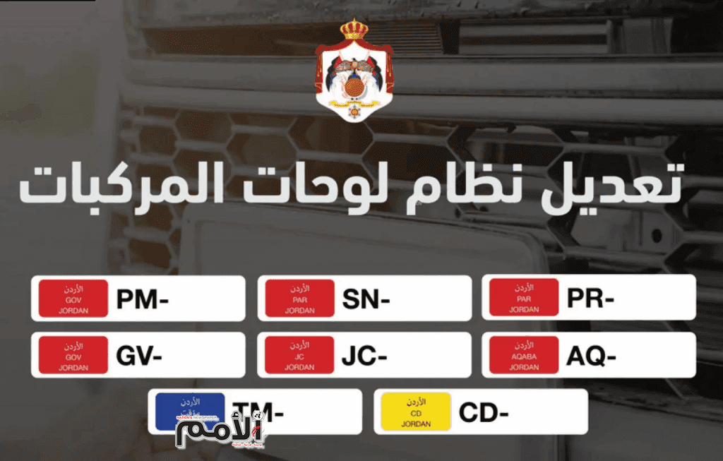 وبموجب التَّعديل، ستحمل لوحات المركبات الحكومية والإدخال المؤقت والدبلوماسية حروفاً واضحة تدل على الجهة التي تتبع لها المركبة وعلى النحو الآتي: رئيس الوزراء والوزراء الرمز PM، مجلس الأعيان SN، ومجلس النواب PR، والمجلس القضائي JC، والجهات الحكومية GV، وسلطة منطقة العقبة الاقتصادية AQ، والهيئات الدبلوماسية CD، والإدخال المؤقت TM.
