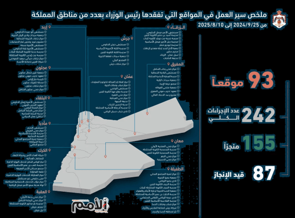 – أظهر التقرير الدوري لسير العمل في المواقع التي تفقدها رئيس الوزراء الدكتور جعفر حسان ضمن جولاته الميدانية التفقدية، أن هذه الجولات شملت 93 موقعا في جميع محافظات المملكة، خلال الفترة ما بين 25 أيلول 2024 وحتى 10 آب 2025.