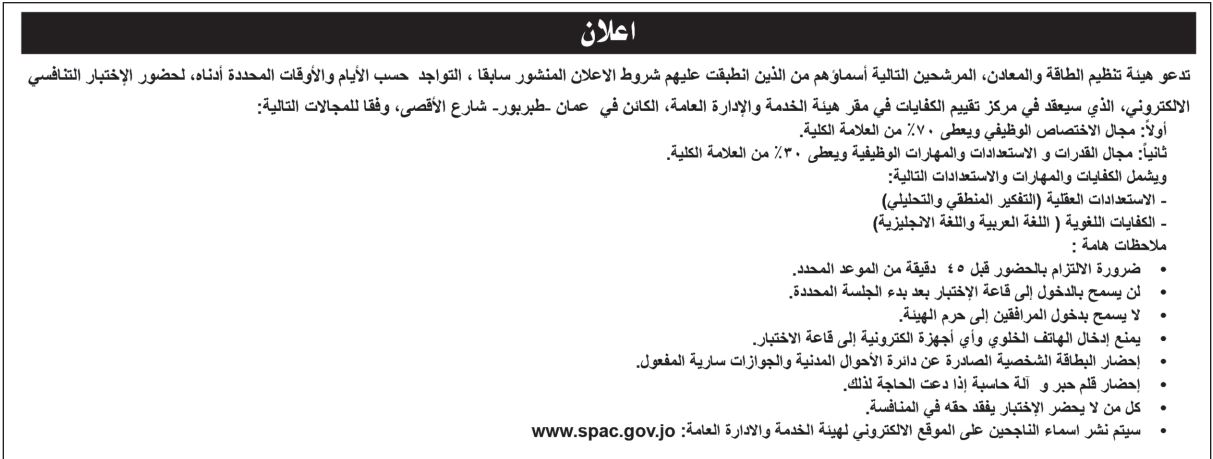 دعت هيئة تنظيم الطاقة والمعادن آلاف الأردنيين الذين انطبقت عليهم شروط وظائف كانت أعلنت عنها سابقا، إلى الامتحان التنافسي الالكتروني في مركز تقييم الكفايات في مقر هيئة الخدمة والإدارة العامة.