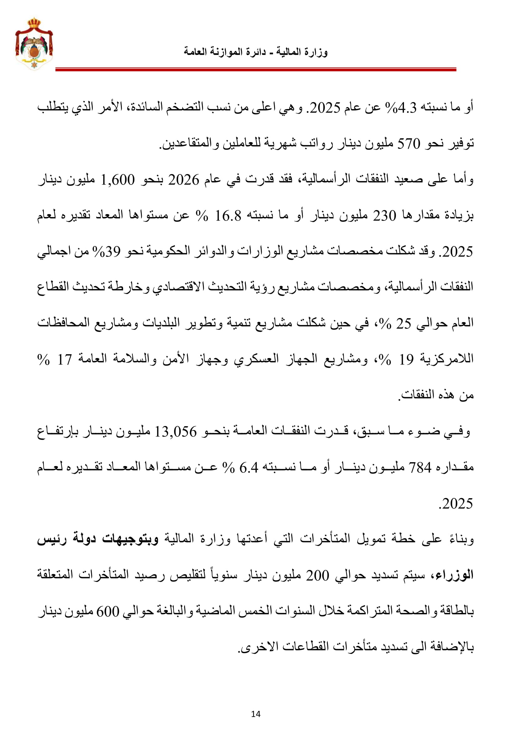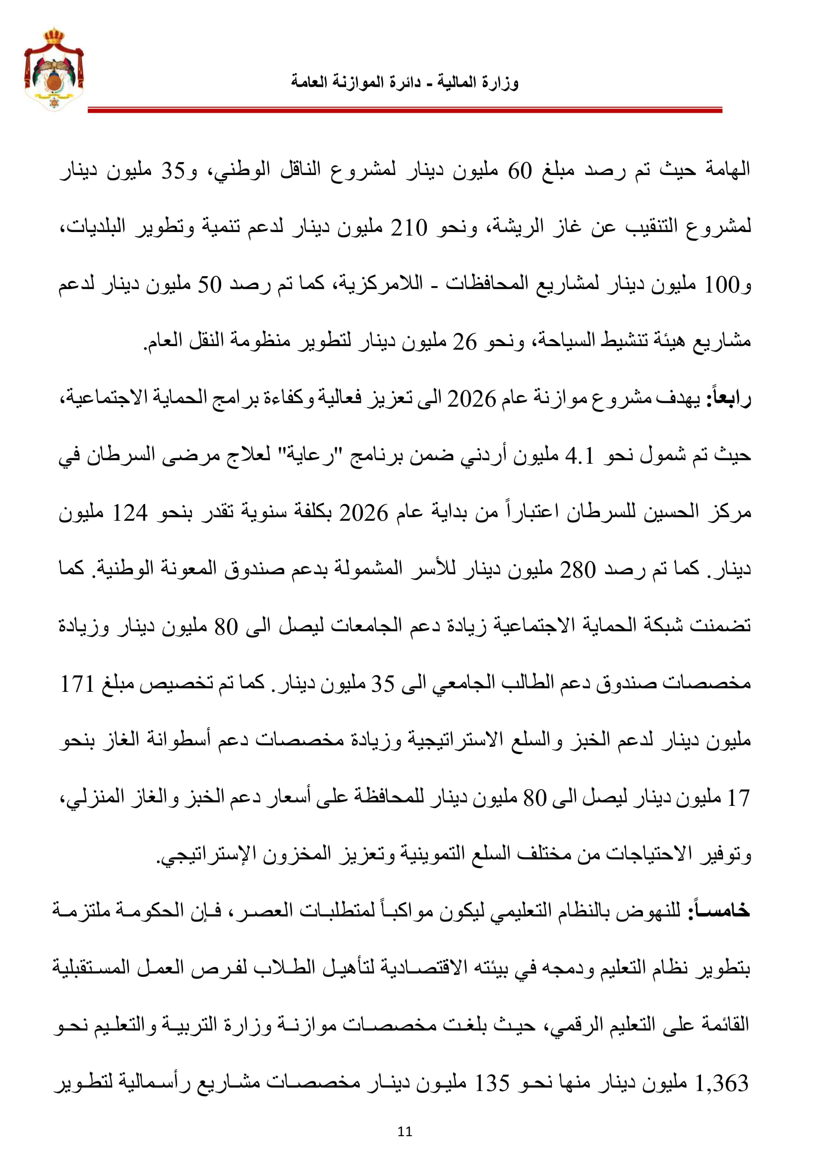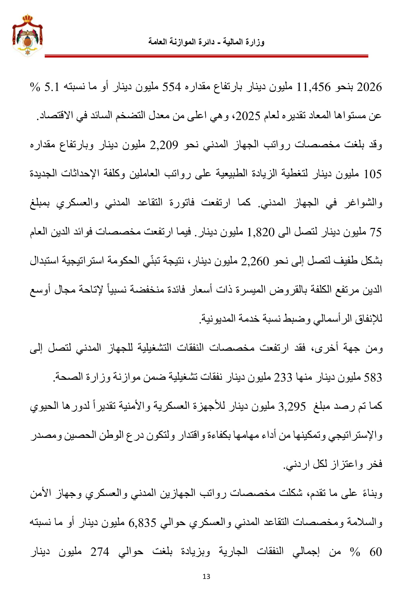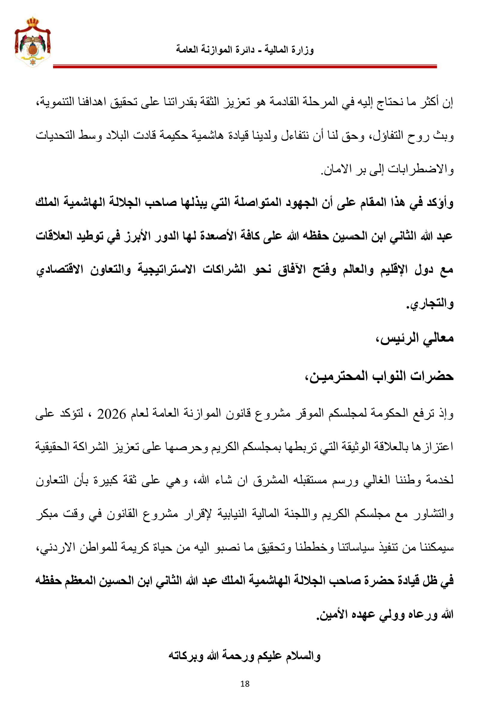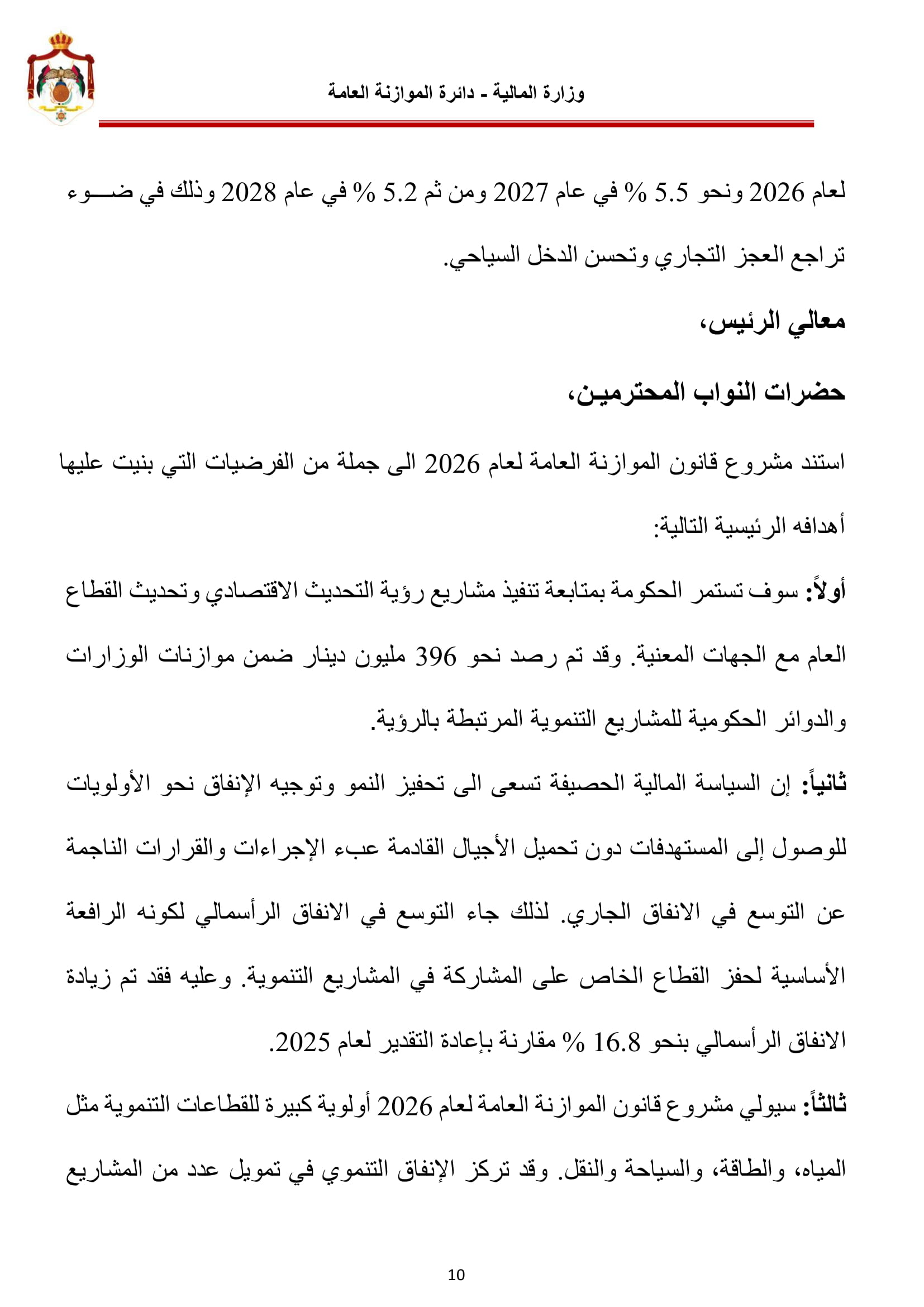 الامم تنشر نص خطاب الموازنة: الاقتصاد الأردني سيشهد مزيدا من النمو خلال عامين شارك ألقى وزير المالية عبد الحكيم الشبلي، الثلاثاء، خطاب مشروع الموازنة العامة لسنة 2026.وقال وزير المالية، إن الناتج المحلي الإجمالي من المتوقع أن ينمو بالأسعار الثابتة بما لا يقل عن 2.9 % لعام 2026.كما توقع الشبلي، نمو الناتج المحلي الإجمالي الإسمي بنسبة 5.4 % لعام 2026، مضيفا أن معدلات التضخم ستبقى معتدلة في الأردن عند 2 %.وأكد خطاب الموازنة أن الاقتصاد الاردني سيشهد مزيدا من النمو والاستقرار خلال العامين القادمين.وتاليا نص خطاب الموازنة: Share and Enjoy !Shares