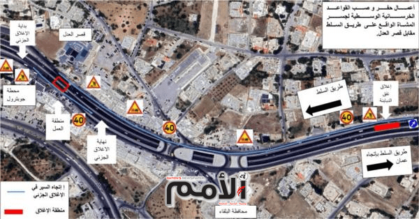 – أعلنت وزارة الأشغال العامة والإسكان عن تنفيذ تحويلات مرورية مؤقتة وجزئية على طريق عمان – السلط مقابل قصر العدل في محافظة البلقاء، وذلك ضمن أعمال الحفريات وصب القواعد الخرسانية في الجزيرة الوسطية.