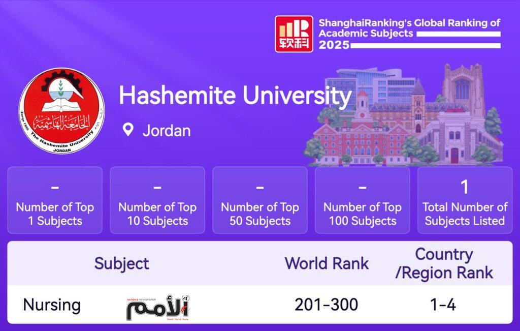 تخصص التمريض في الجامعة الهاشمية ضمن الفئة (201–300) عالميًا في تصنيف شنغهاي 2025حقّق