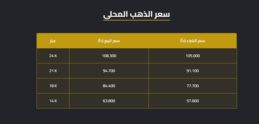 وبلغ سعر الغرام الواحد من الذهب عيارات 24 و18 و14 لغايات البيع من محالّ الصاغة 108.30 و84.40 و63.80 دينارا على الترتيب.