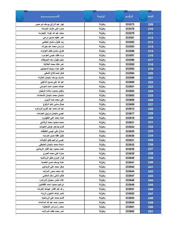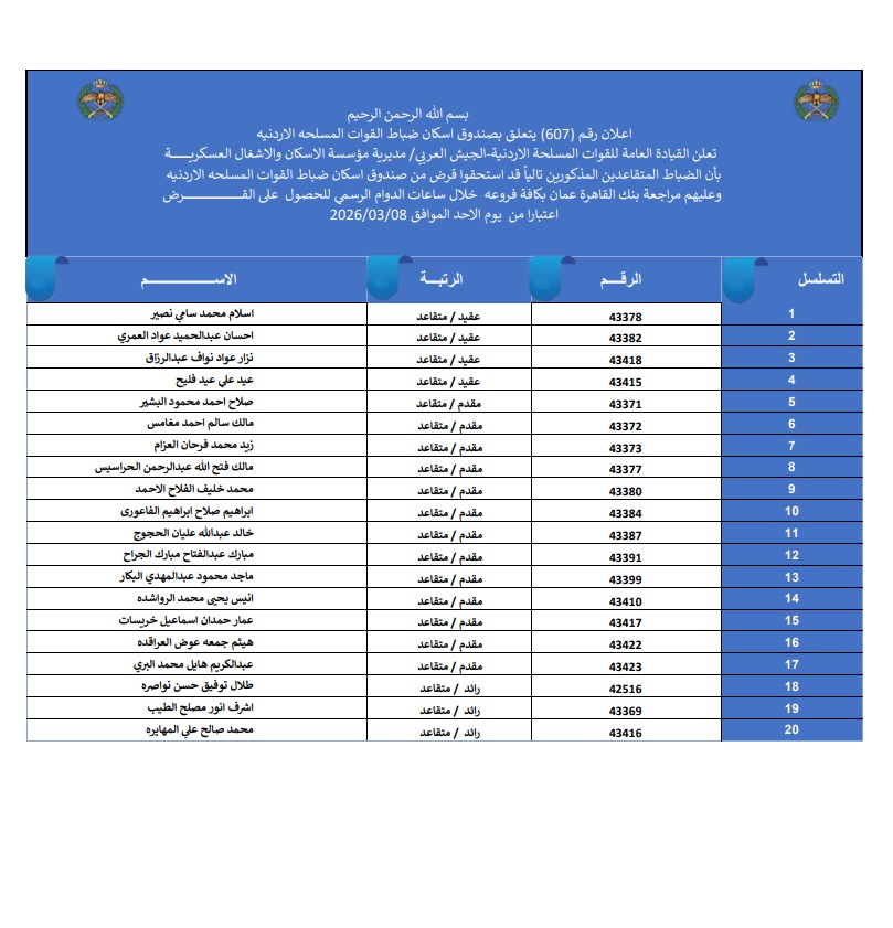 –  أعلنت القيادة العامة للقوات المسلحة الأردنية – الجيش العربي/ مديرية مؤسسة الإسكان والأشغال العسكرية بان الضباط وضباط الصف والأفراد المبينة أسماءهم أدناه قد استحقوا قرض الإسكان العسكري (الخاص بالافراد) والضباط المستفيدين من صندوق إسكان الضباط مراجعة بنك القاهرة عمان بكافة فروعه خلال ساعات الدوام الرسمي اعتباراً من يوم الأحد الموافق 8/03/2026 للحصول على القرض.