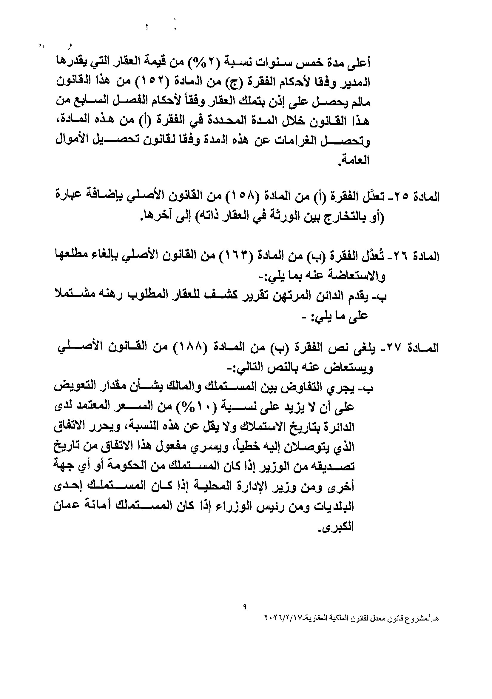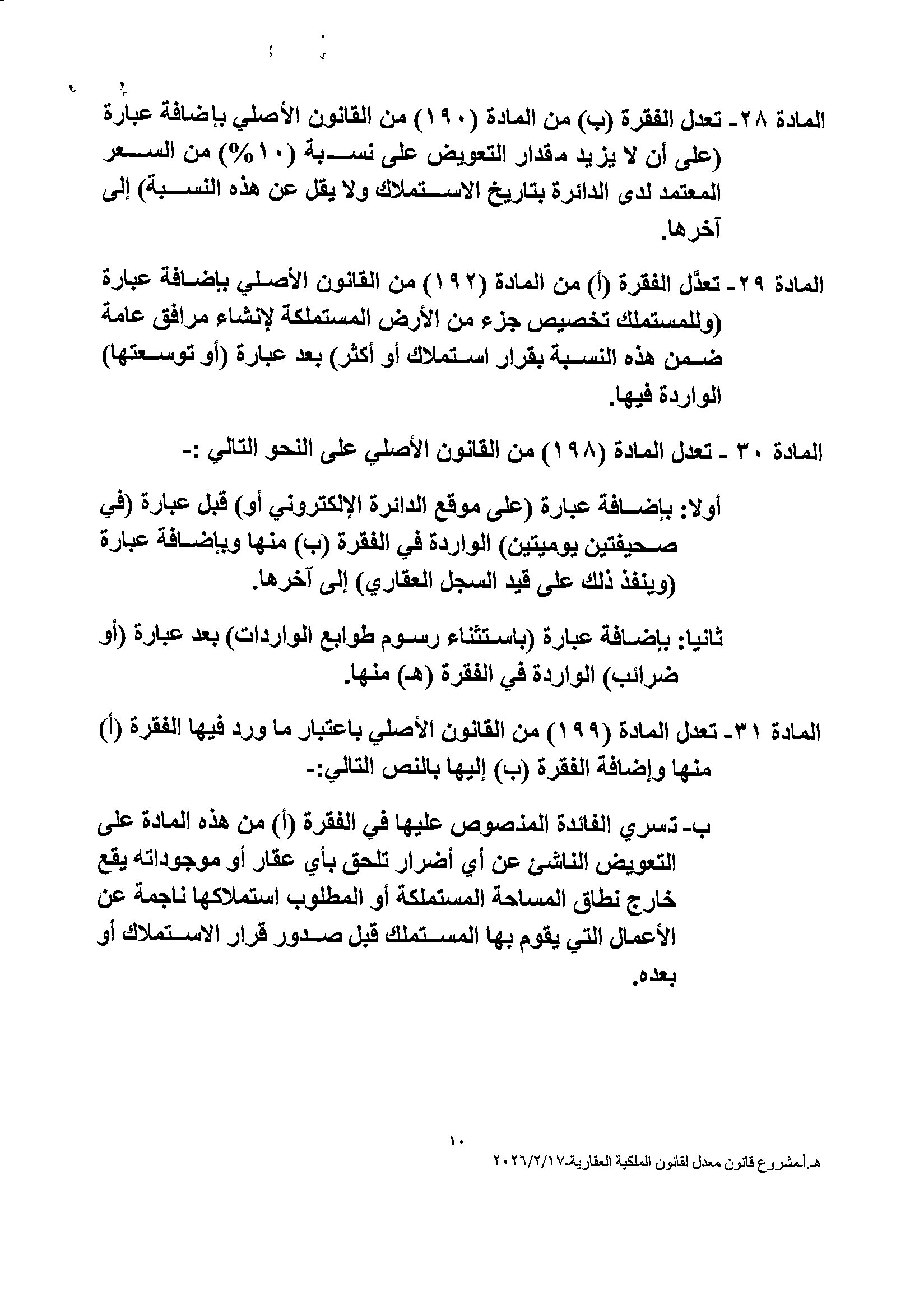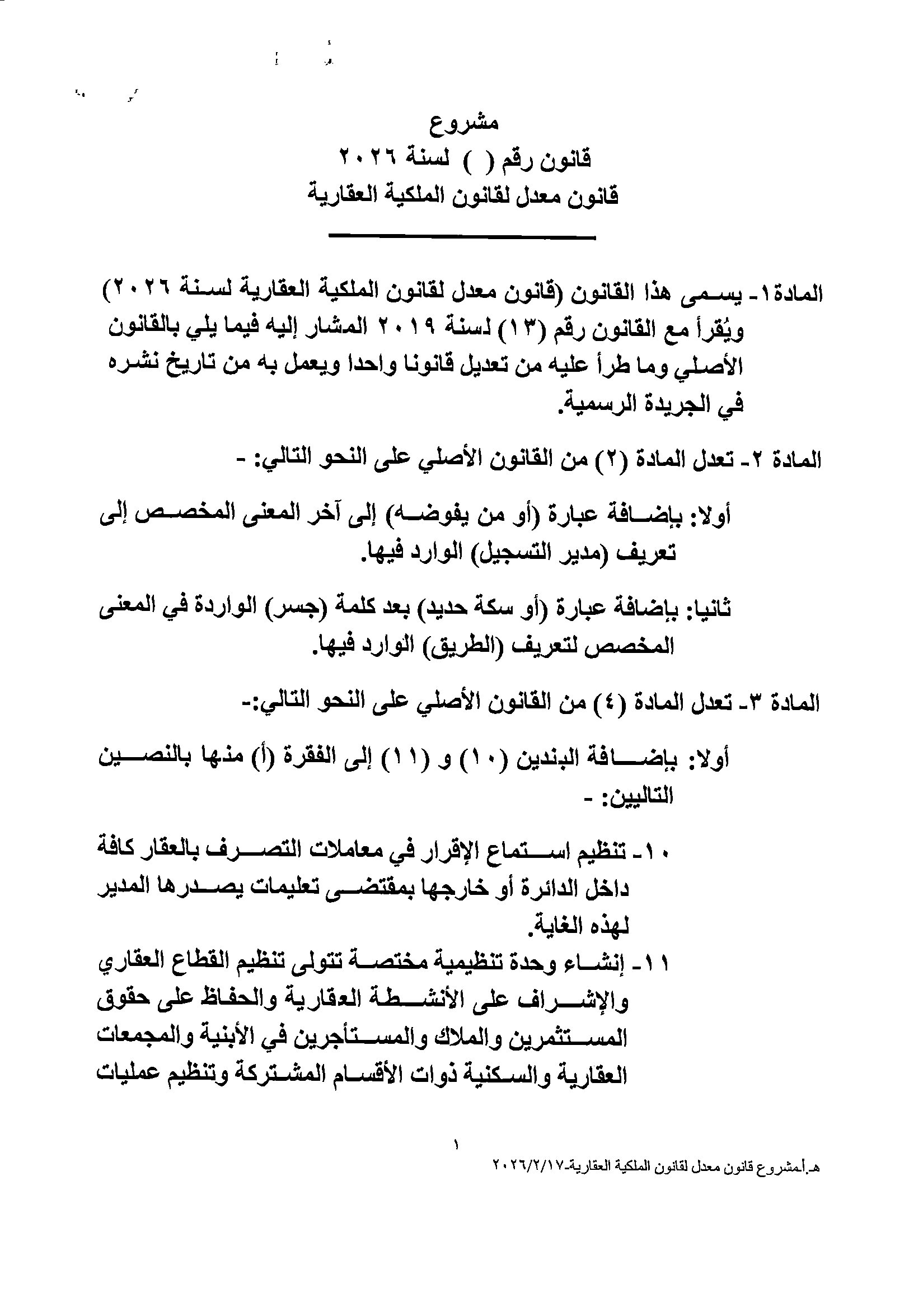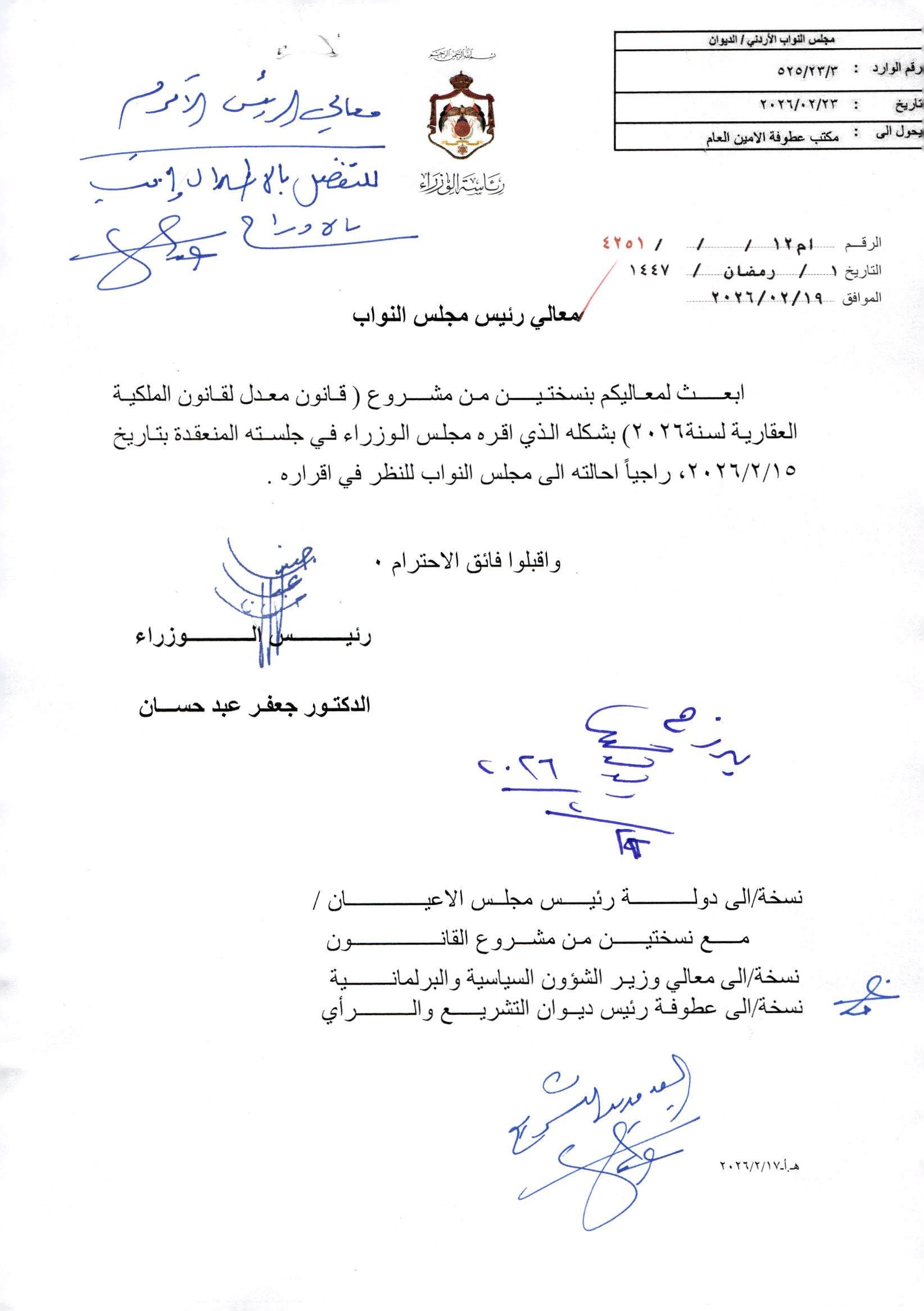 – أدرج مجلس النواب مشروع القانون المعدل لقانون الملكية العقارية لسنة 2026 على جدول أعمال جلسته المقرر عقدها يوم غد الاربعاء عند الساعة الحادية عشرة، ضمن ملحق لجدول الأعمال.