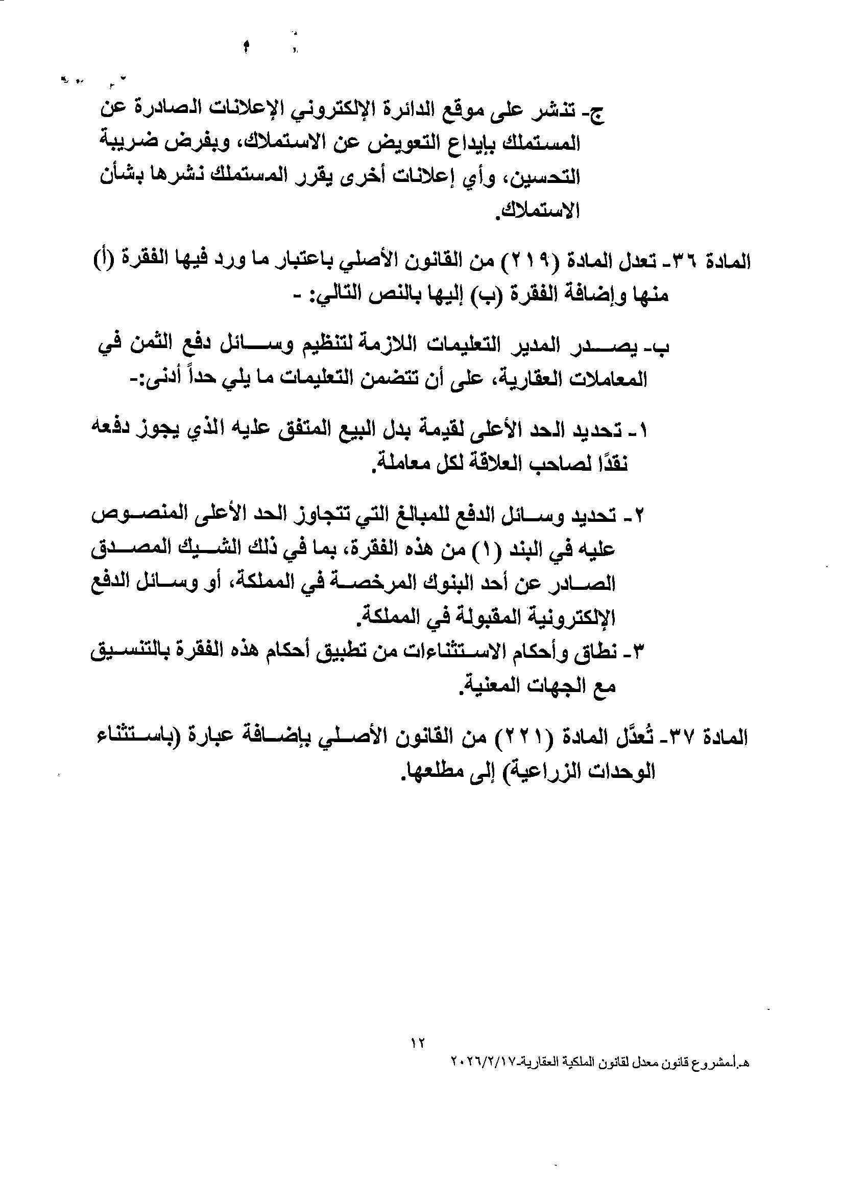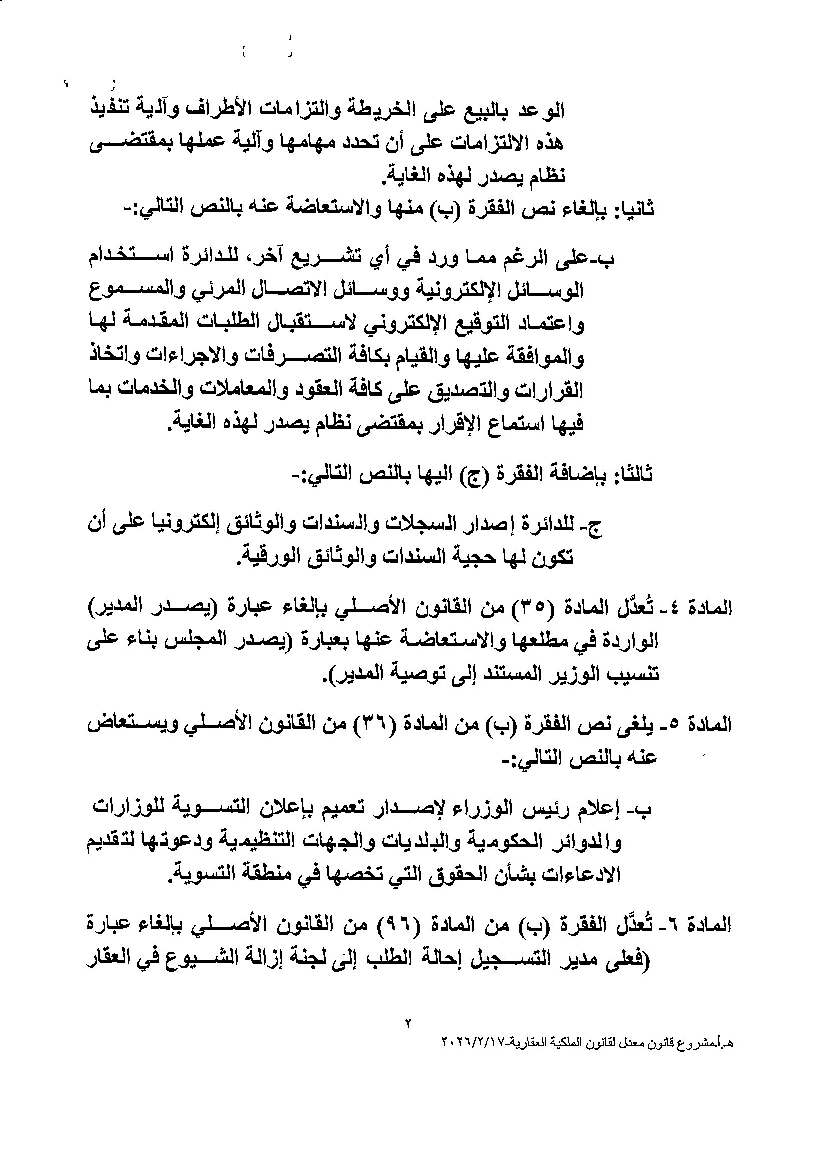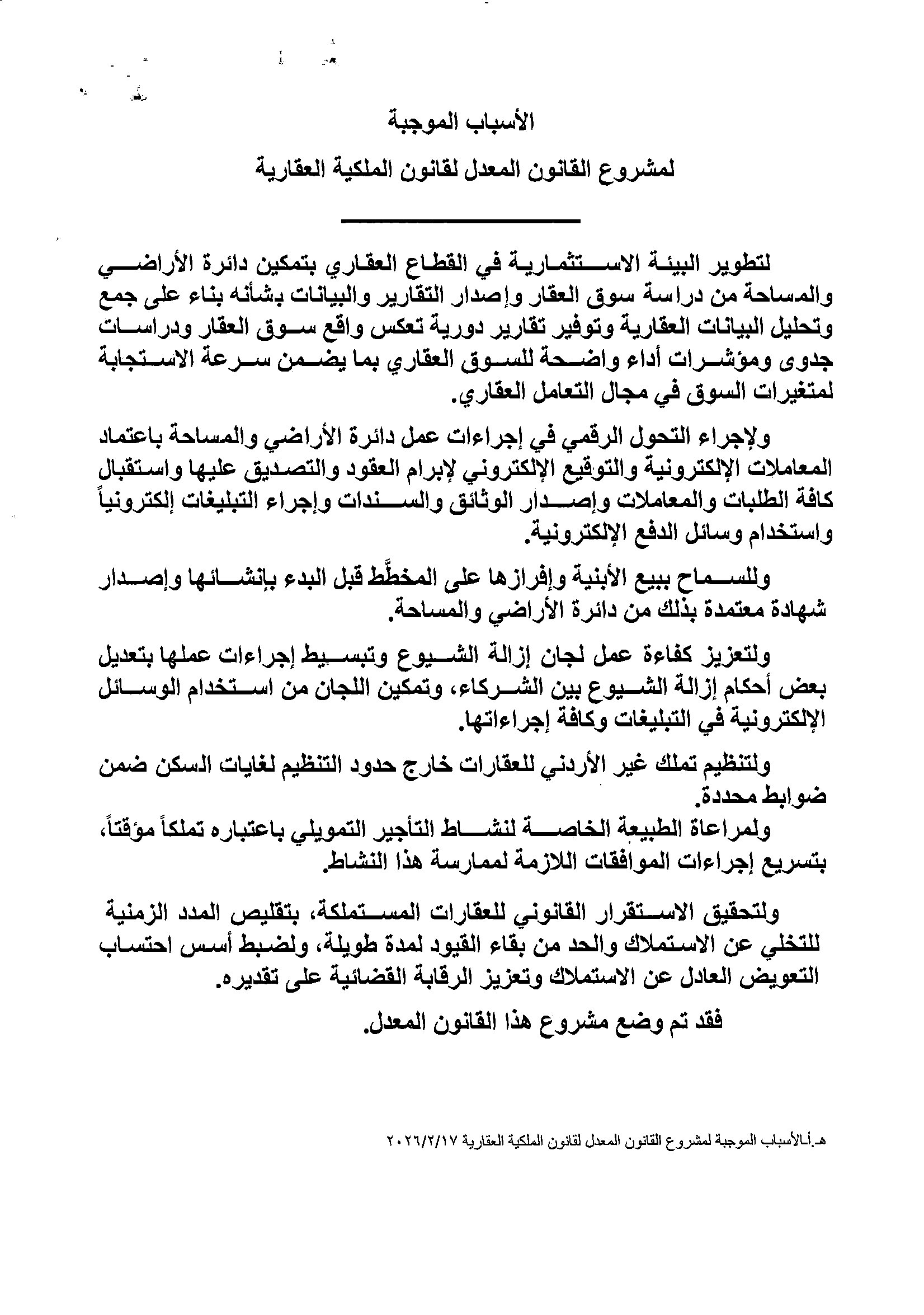ويتضمَّن مشروع القانون نصوصاً تجيز البيع الإلكتروني، واعتماد التَّوقيع الإلكتروني، إلى جانب رقمنة جميع الإجراءات والمعاملات، بما في ذلك الدَّفع والإفراز والبيع؛ بحيث تصبح جميع الإجراءات إلكترونيَّة وبما يتوافق مع أحكام قانون الكاتب العدل، إلى جانب تخفيف الأعباء الماليَّة والإجرائيَّة المترتِّبة على النَّشر الورقي؛ وذلك بهدف التَّسهيل على المواطنين وتخفيف الكلف والوقت والجهد عليهم، وفق ما جاء في الاسباب الموجبة.
