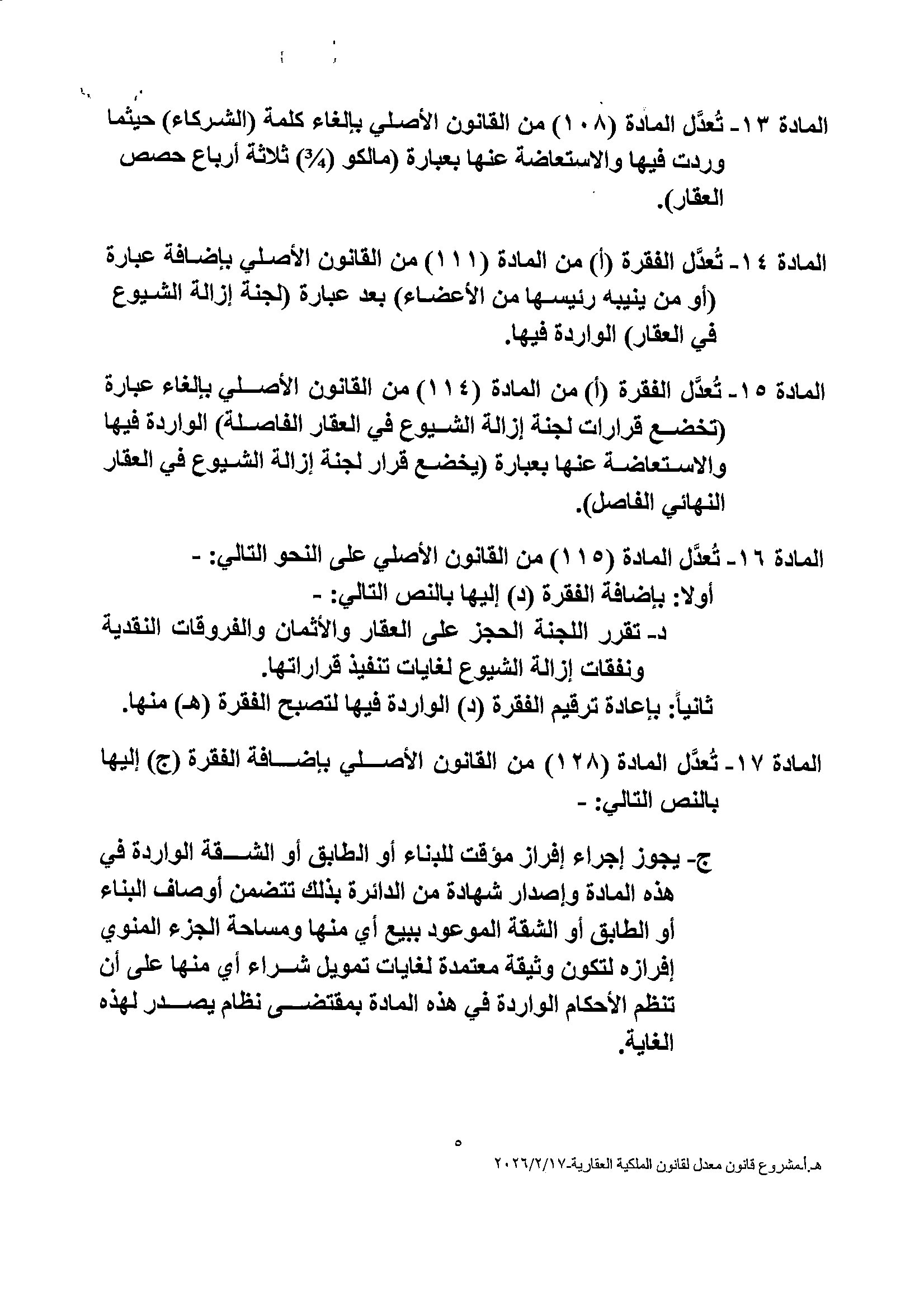 كما تضمَّنت استبدال شرط إجماع الشركاء في قسمة العقارات المقام عليها أبنية، ليصبح بشرط موافقة مالكي ثلاثة أرباع العقار، وذلك دون الإخلال بحقوق باقي الشركاء.