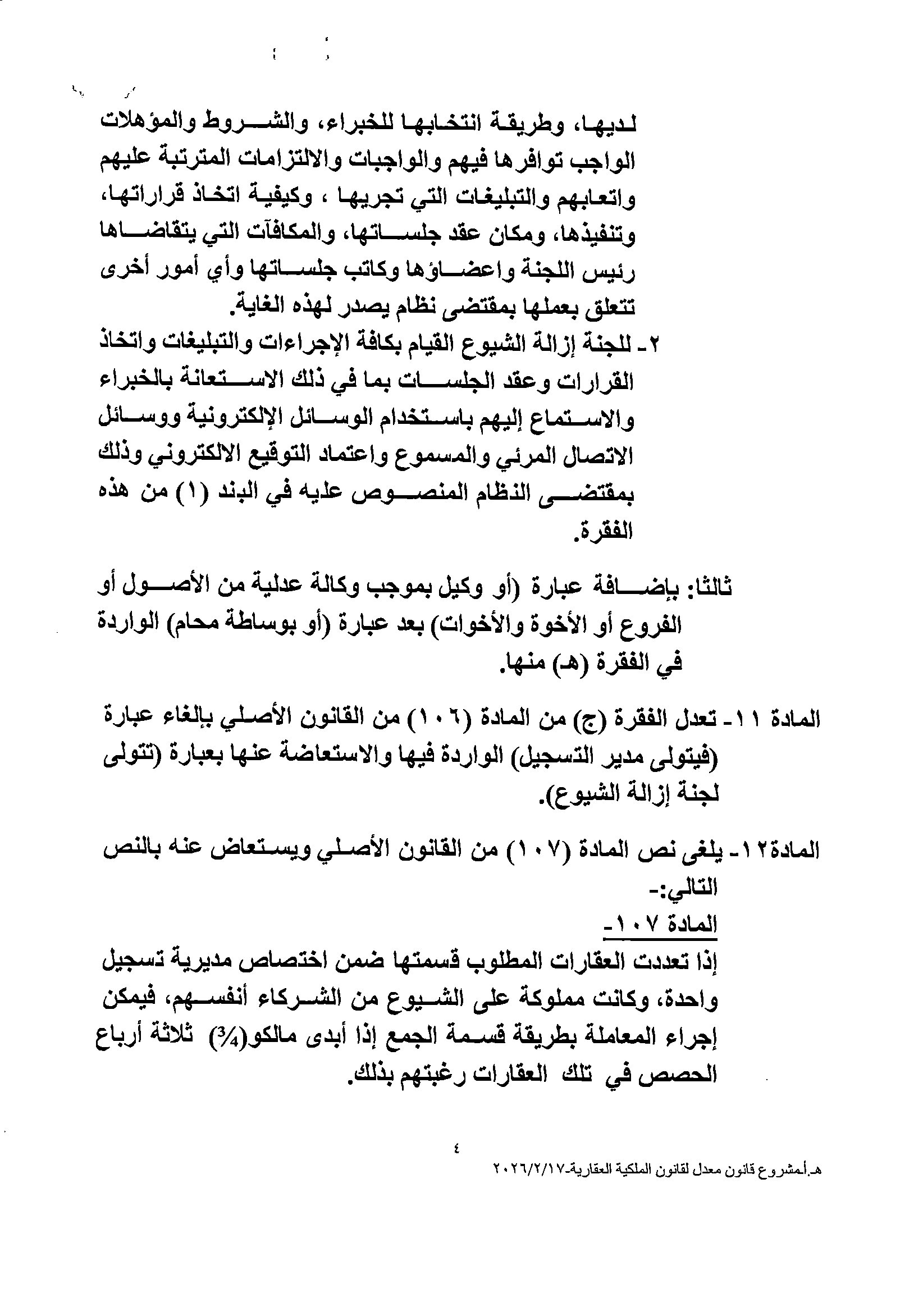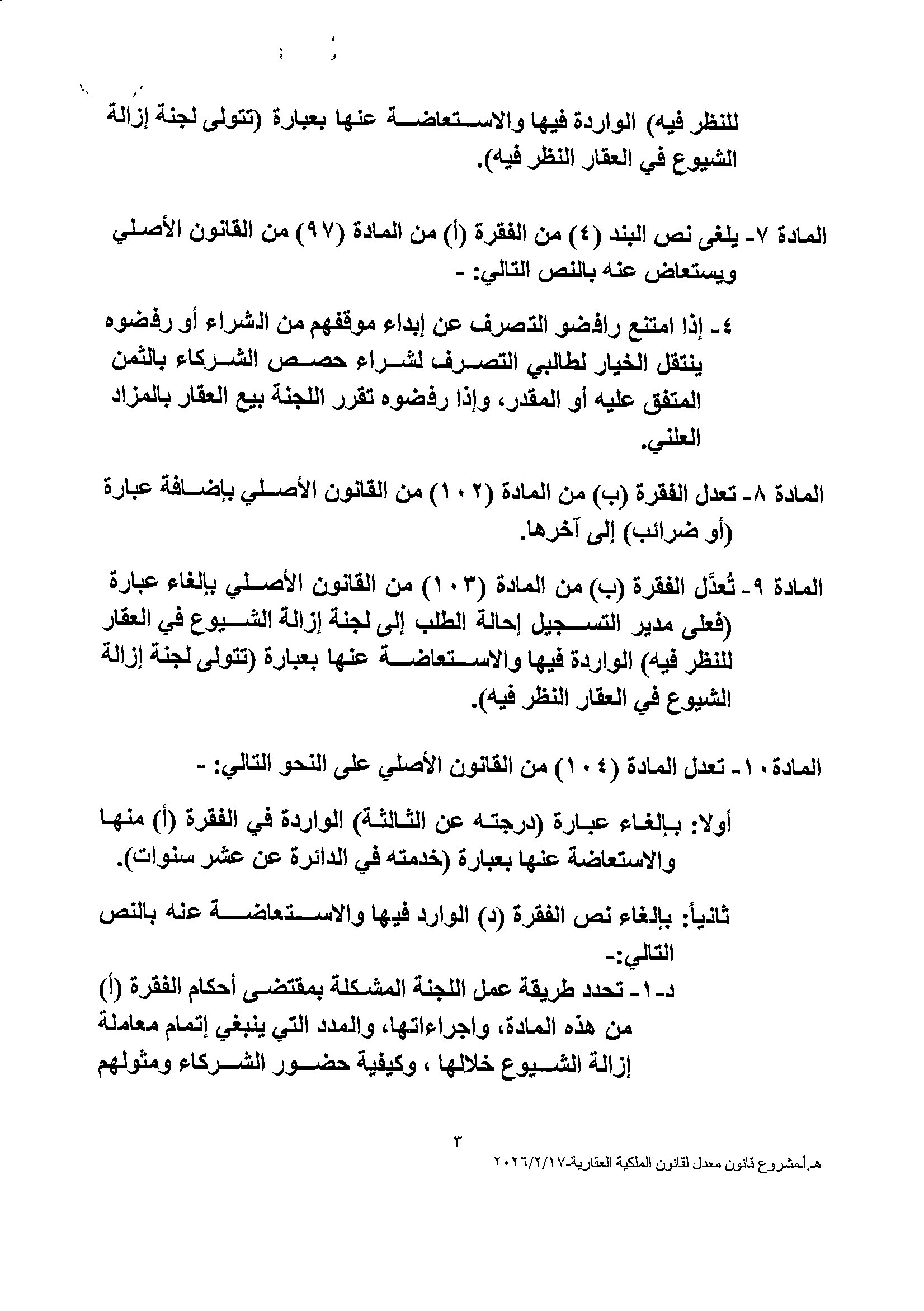 وكان أقر مجلس الوزراء الشهر الماضي، مشروع القانون، والذي يهدف إلى تسهيل عملية إزالة الشيوع بين الشركاء، وذلك بتبسيط إجراءاتها وتسريعها، ليسهم في حل الكثير من القضايا العالقة منذ سنوات حول آلاف العقارات، وإدخال عقارات غير مستغلة إلى الدورة الاقتصادية.