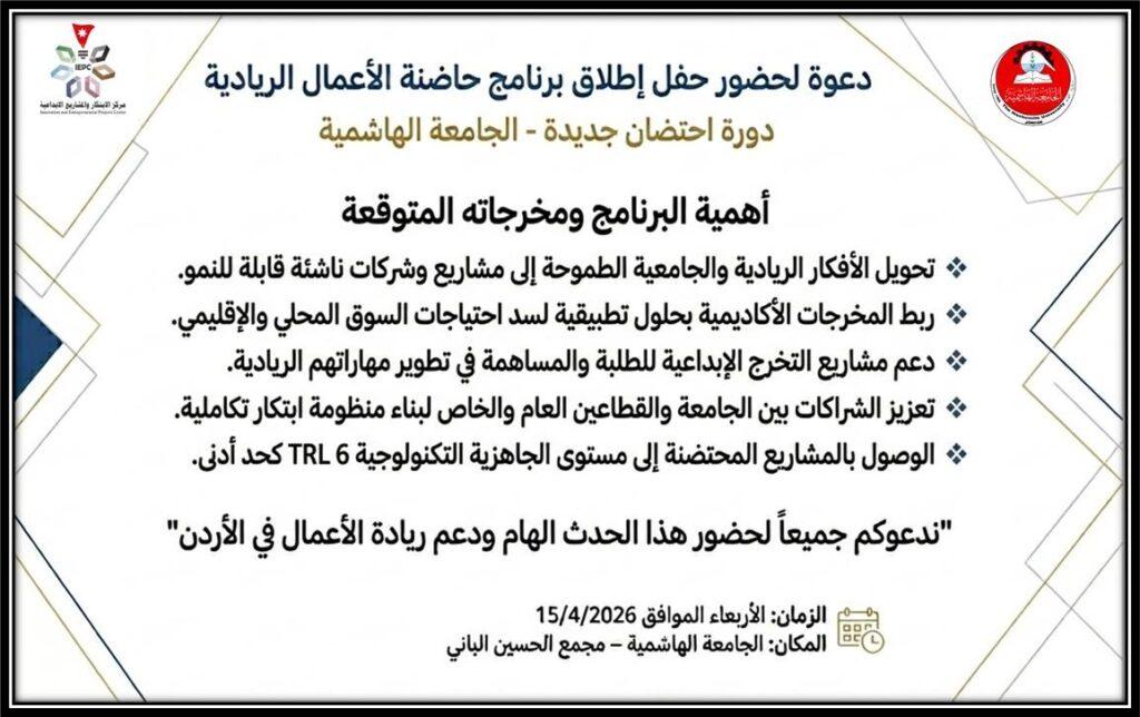الامم- مريم القطشان – انسجامًا مع الرؤى الملكية السامية الداعمة للابتكار وتحفيز ريادة الأعمال عند الطلبة، تطلق الجامعة الهاشمية “الدورة الأولى لاحتضان المشاريع الريادية الجامعية” بالتعاون مع منصة ZINC، وذلك في تمام الساعة الـ(10) من صباح يوم الأربعاء الموافق 15 نيسان 2026، في مجمع الحسين الباني في حرم الجامعة.ويهدف البرنامج إلى بناء منظومة متكاملة ومستدامة داعمة للابتكار من خلال ربط المخرجات الأكاديمية بالتطبيقات العملية واحتياجات السوق، ودعم المشاريع الطلابية الريادية ماليًا وفنيًا وتقنيًا، وتعزيز الشراكات مع القطاعين العام والخاص.وتشهد الفعالية عقد جلسات حوارية وورش عمل متخصصة بمشاركة نخبة من الخبراء ورواد الأعمال، تتناول مسارات تحويل الأفكار إلى مشاريع سوقية، ونماذج الأعمال، وفرص التمويل، وبناء الشراكات إضافة إلى استعراض قصص نجاح وطنية ملهمة.وسيتم خلال حفل الاطلاق، عرض معايير اختيار المشاريع الريادية، وآلية التقديم، والفئات المستهدفة من الطلبة، ومقدار الدعم المالي المقدّم للمشاريع من مرحلة الفكرة وصولًا إلى تأسيس الشركة الناشئة، كما يتضمن البرنامج مراحل الاحتضان المتكاملة التي تشمل التدريب المتخصص، والاستشارات الفنية والمالية، والتشبيك مع الخبراء، وتقديم مختلف أشكال الدعم، وصولًا إلى تحقيق الجاهزية التقنية أو تأسيس شركات ناشئة تسهم في توفير فرص العمل والدخل للطلبة والخريجين.
