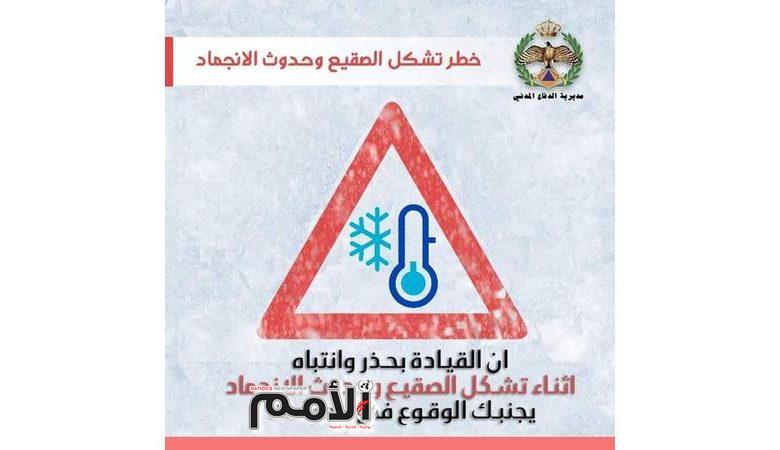 يرجى اخذ اقصى درجات الحيطة والحذر عند القيادة على الطرقات التي يحدث فيها الانجماد، خوفاً من الانزلاقات بفعل تجمد مياه الأمطار عليها، خاصة مرتفعات المملكة، بما في ذلك مرتفعات العاصمة، وعدم الخروج الا للضرورة القصوى