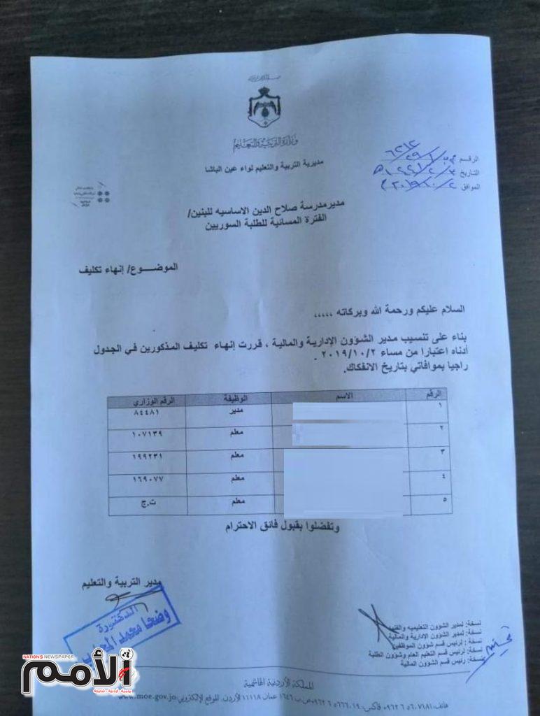وجاء في الكتاب، الموجه الى مدرسة صلاح الدين الاساسية للبنين، بناء على تنسيب من مدير الشؤون المالية والادارية “قررت انهاء تكليف المذكورين في الجدول ادناه اعتباراً من تاريخ 2/10/2019.